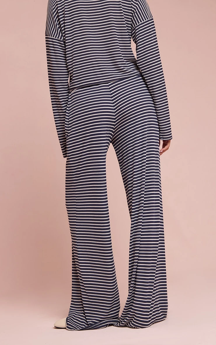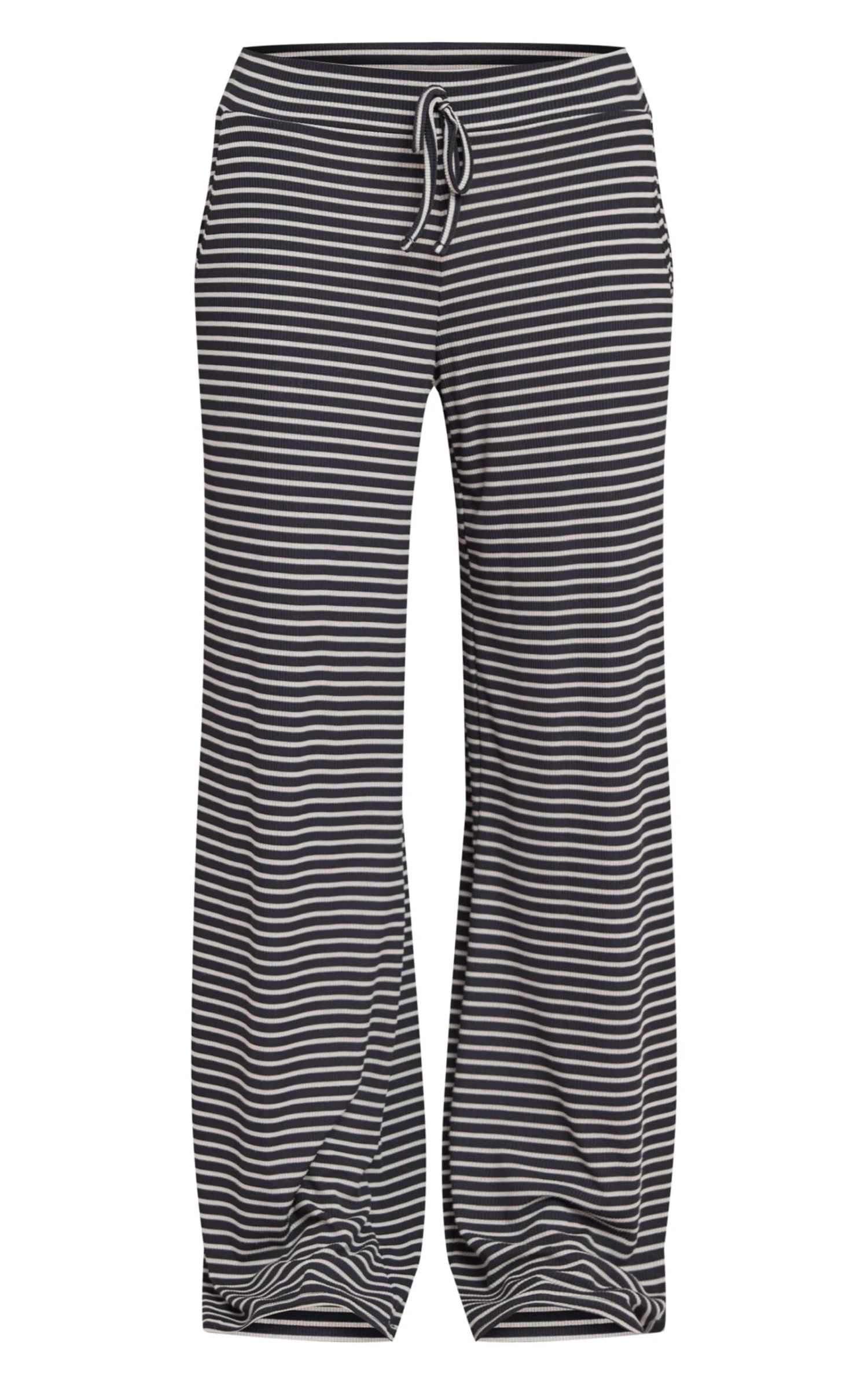 Own your off-duty aesthetic with ease in the navy ribbed striped drawstring wide leg pant. This piece offers a relaxed wide leg silhouette, perfect for effortless day dressing, complete with a functional drawstring waist for a custom fit. Its distinct ribbed texture and bold stripes add a touch of artful detail to your everyday. Team with the coordinating long-sleeve top for a cohesive look, or choose a crisp white t-shirt for understated appeal, finishing with a pair of sleek flats and simple hoops for an undeniably confident ensemble.