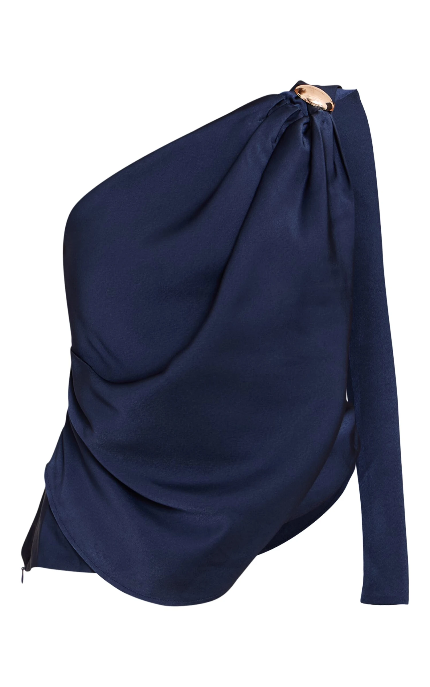 Define your aesthetic with a piece that captivates. The navy satin drape trim detail top presents a distinctive one-shoulder cut, showcasing a bold gold-tone ring at the shoulder that anchors sweeping drapes. Its form extends into an asymmetric hem, ensuring a dynamic finish that moves with purpose. Pair this versatile top with high-waisted tailored pants for an elevated day aesthetic, or style it alongside relaxed wide-leg linen pants and minimalist sandals for an understated, self-assured look that speaks volumes.