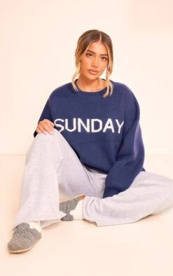 Elevate your knitwear collection with this navy jacquard sweater. The ‘Sunday’ motif adds a considered touch to this essential piece. Crafted from a comfortable knit, the subtle jacquard detailing lends textural interest. Style yours with tailored pants from our bottoms collection for a refined yet effortless weekend look.