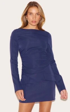 Refine your after-dark edit with this navy bodycon dress. Cut from a refined woven fabric, the tailored silhouette features a subtle ruched detail to accentuate the form. The long sleeves offer a sophisticated counterpoint to the close fit. Style yours with a sculptural gold cuff from our jewelry collection for a considered evening statement.