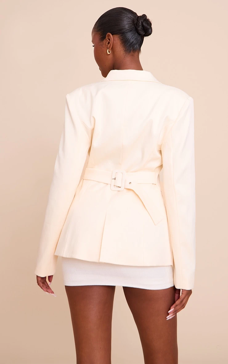 Curate an impactful evening ensemble with purpose. The off white cinched back single breasted blazer offers a commanding silhouette, defined by its sharp notched lapels and a deep V-neckline that exudes confident ease. Its single-breasted design is secured by two clean values, while the structured, tailored cut is enhanced by a discreet cinched detail at the back, shaping a refined profile. Thoughtfully designed with functional flap pockets and a subtle chest welt pocket, this blazer is a versatile piece to anchor your after-dark look. Style it with coordinating tailored pants for a powerful statement, or layer over a minimal slip dress and sharp heels for a sophisticated, deliberate presence.