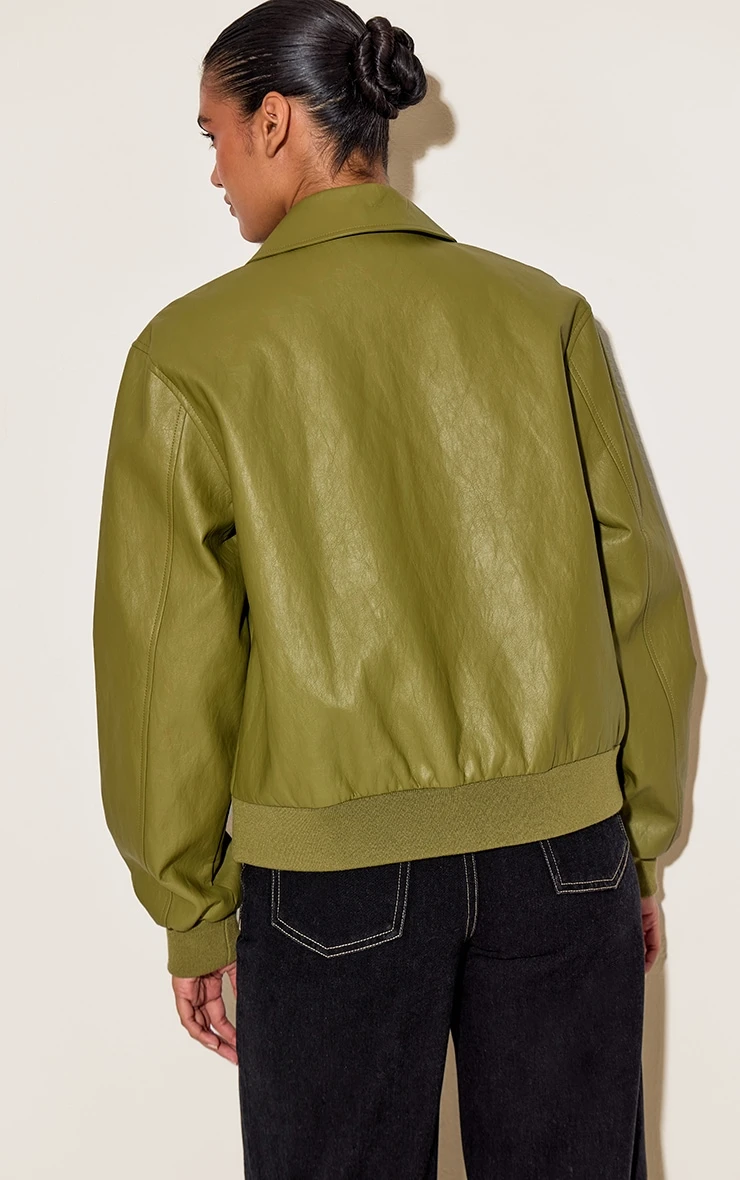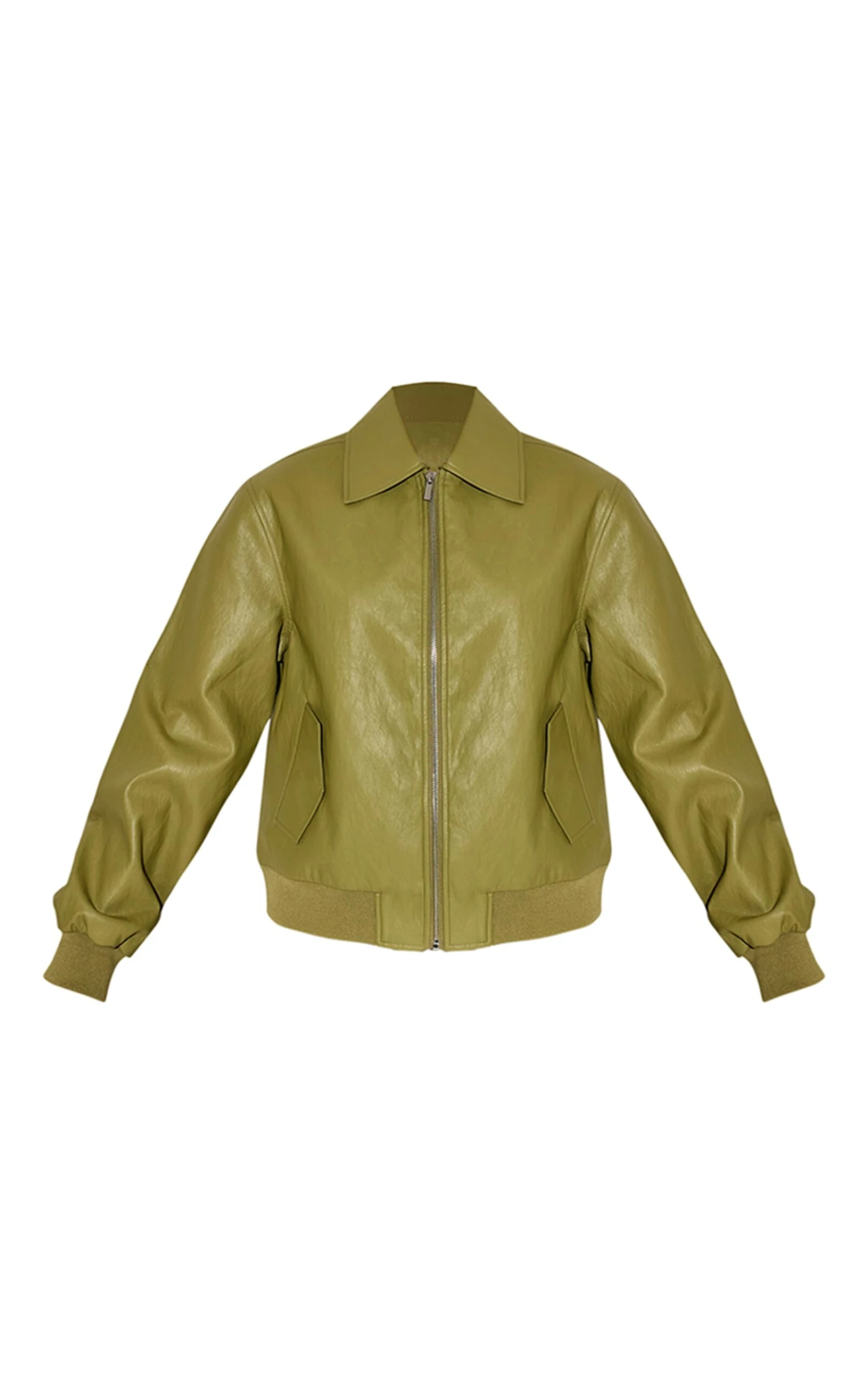 Effortless cool just found its hero piece. The olive faux leather bomber jacket reframes a classic silhouette with a confident, modern edge, showcasing a clean point collar and a statement silver-tone zip fastening that runs through its front. Neatly ribbed cuffs and hem secure its relaxed shape, while discreet welt pockets offer a streamlined finish. This versatile outer layer instantly elevates any ensemble; throw it over tailored black pants and a simple tee for a sharp daytime look, or pair with dark wash jeans and fresh sneakers for an unforced, artful off-duty vibe that truly understands style.