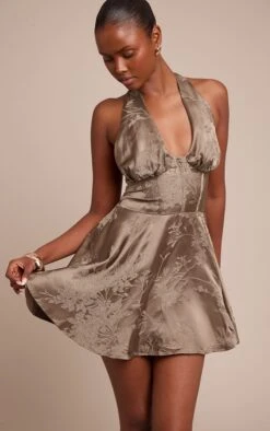 The olive satin jacquard mini shift dress is a timeless piece with a luxurious finish. Crafted in glossy satin with jacquard detailing, the shift silhouette skims the body, offering understated glamour in a rich olive tone. Pair with gold jewelry and strappy sandals for evening elegance, or style with a blazer and mules for chic daytime events.