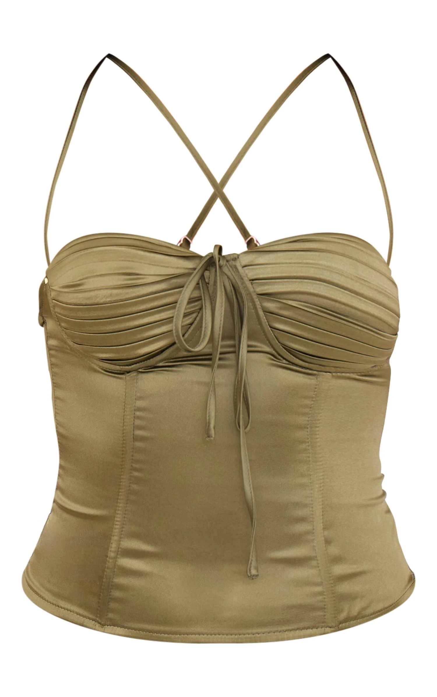 Elevate your after-dark edit with this olive satin corset. The pleated bust detail adds a touch of architectural interest, while the pointed hem creates a defined silhouette. Crafted in a refined satin, this piece offers a subtle sheen that catches the light. For an evening ensemble that commands attention, pair it with wide-leg pants from our bottoms collection and a sculptural clutch.