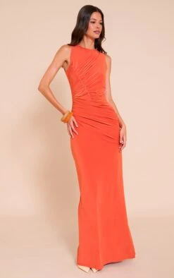 Command attention at your next event. The orange double layer soft touch extreme ruched maxi dress brings confident appeal with its striking round neckline and sleeveless cut. Cleverly designed ruching details cascade across the bodice and down the length, creating a streamlined, close-fitting shape that extends to a refined maxi hem. Elevate this show-stopping piece with high-heeled mules and minimal gold jewelry for an effortlessly chic occasion look.