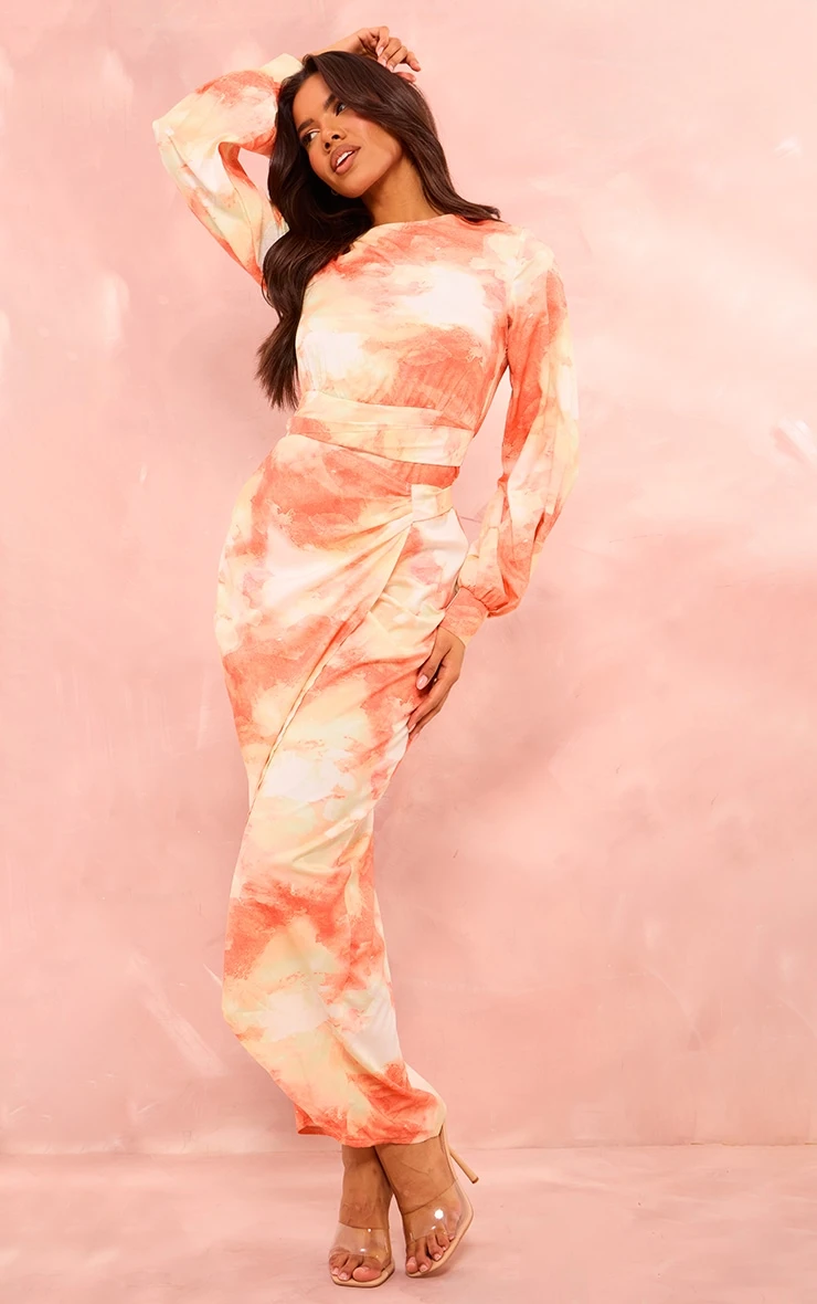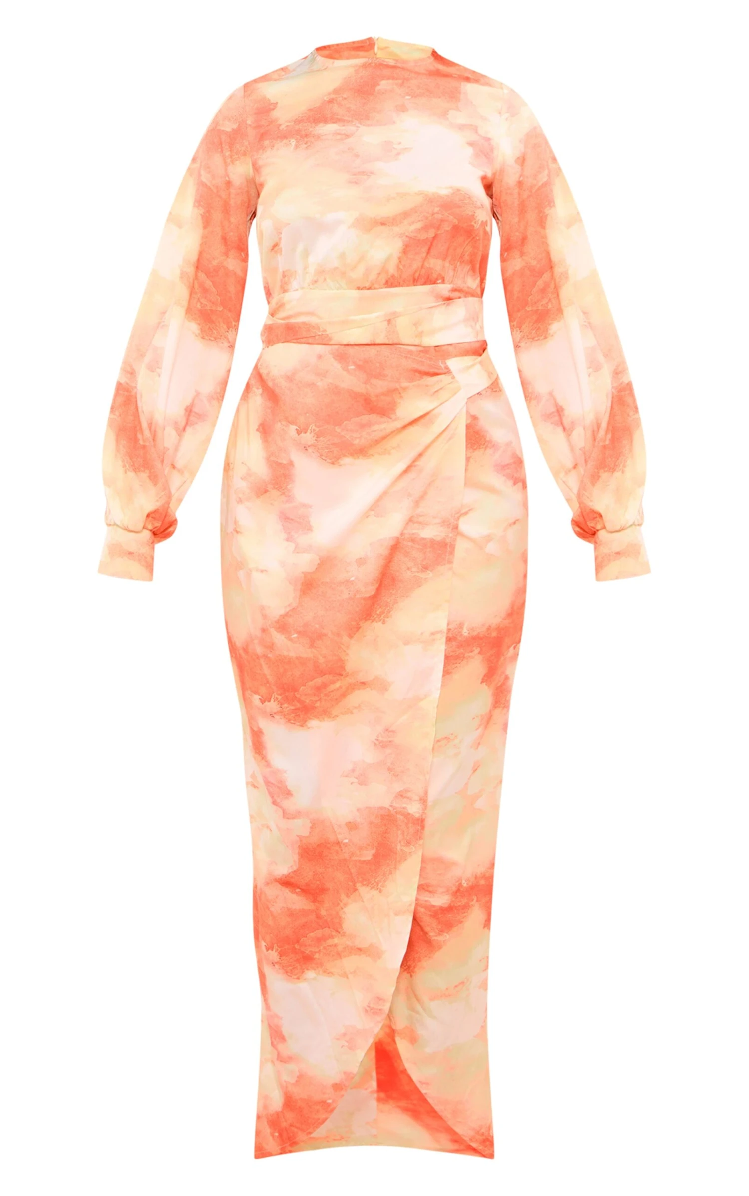 Make a serious style statement in this maxi dress. Featuring an orange watercolour print material with a tassel tie detail and wrap front design. We love this styled with heels to complete the look.