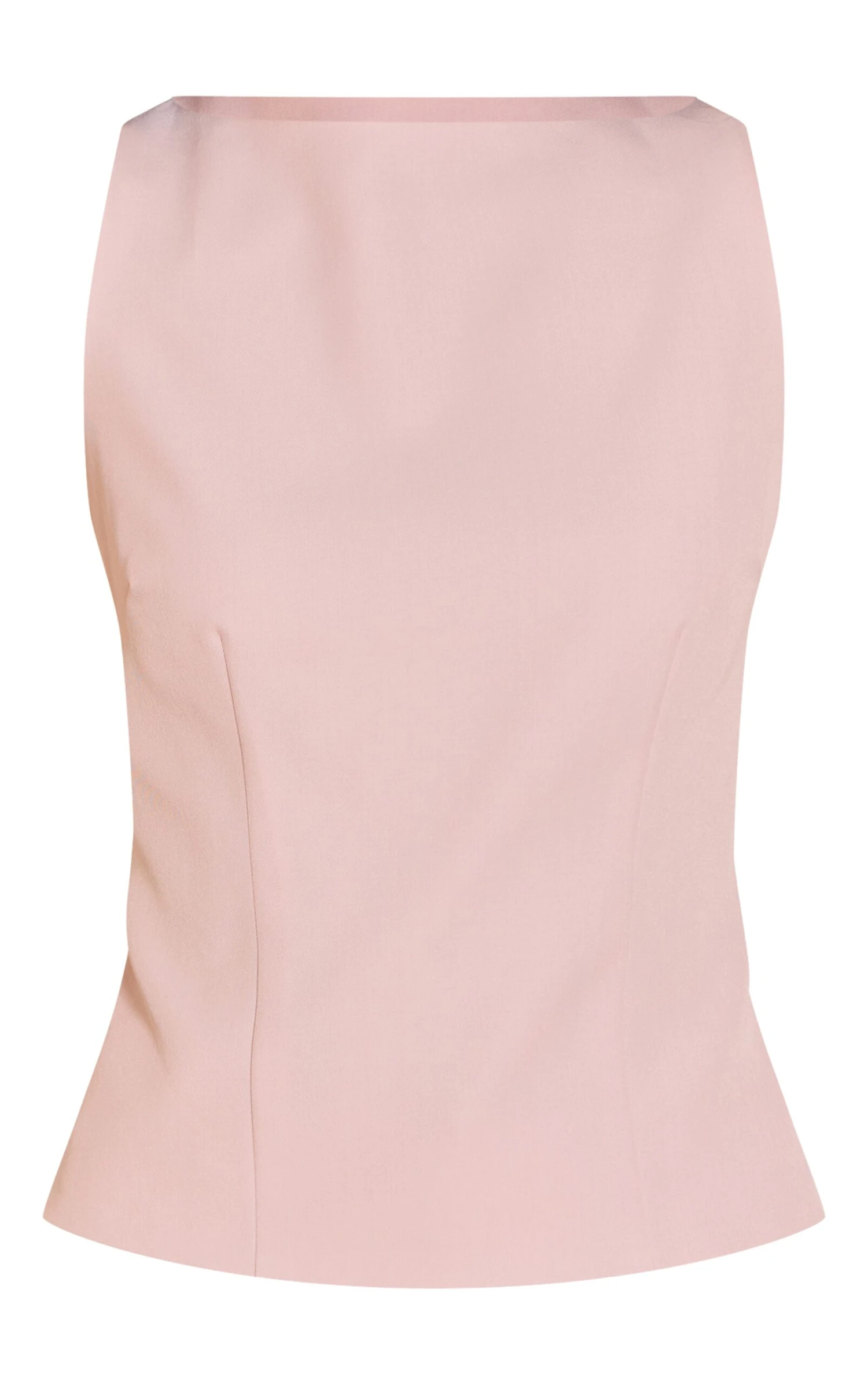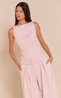 Freshen up your wardrobe staples with the pale pink racer neck detail top. Made from soft stretch jersey with a sleek, fitted shape, it’s designed to flatter. Pair with the matching wide leg pants or denim for a clean, minimal look.