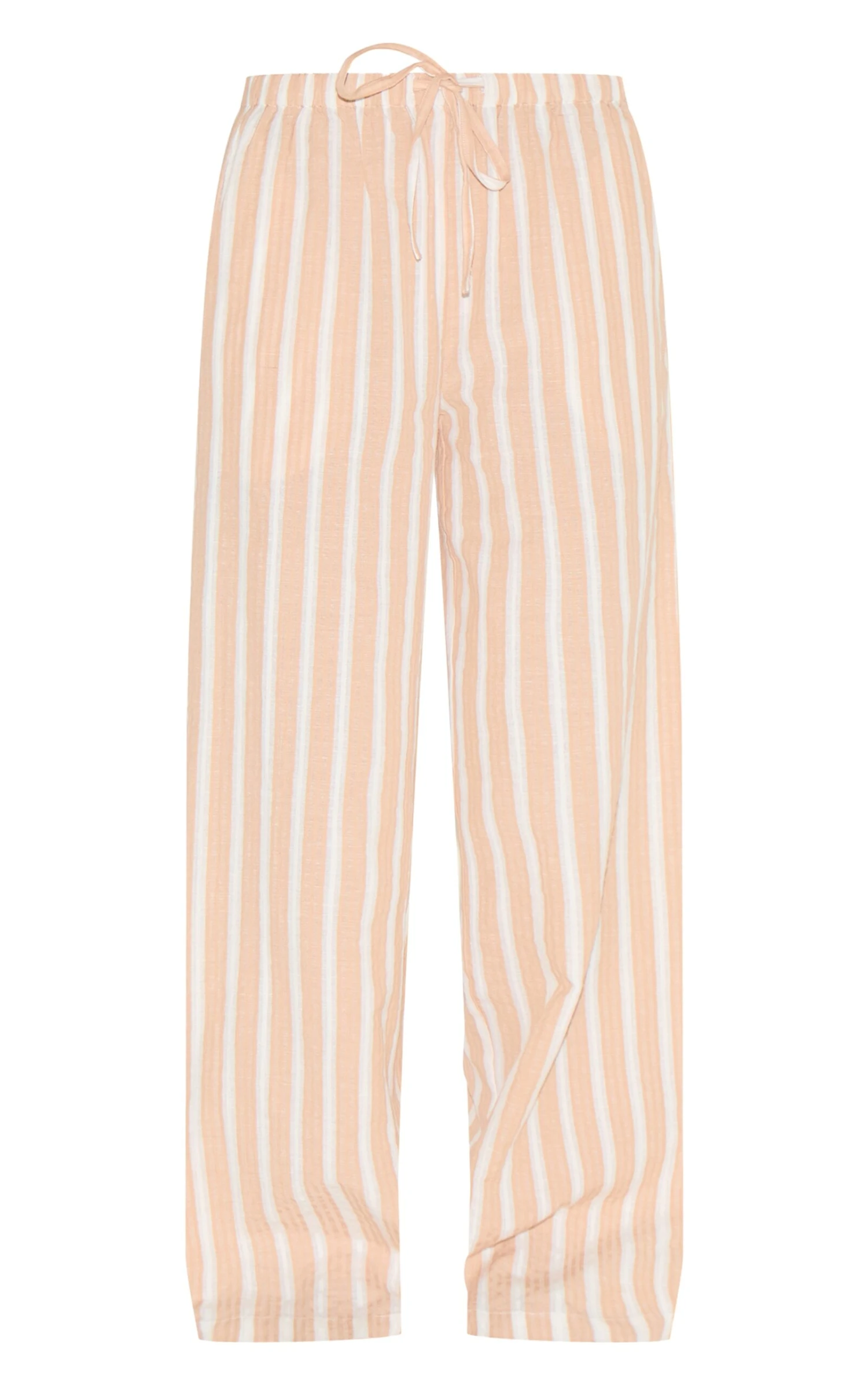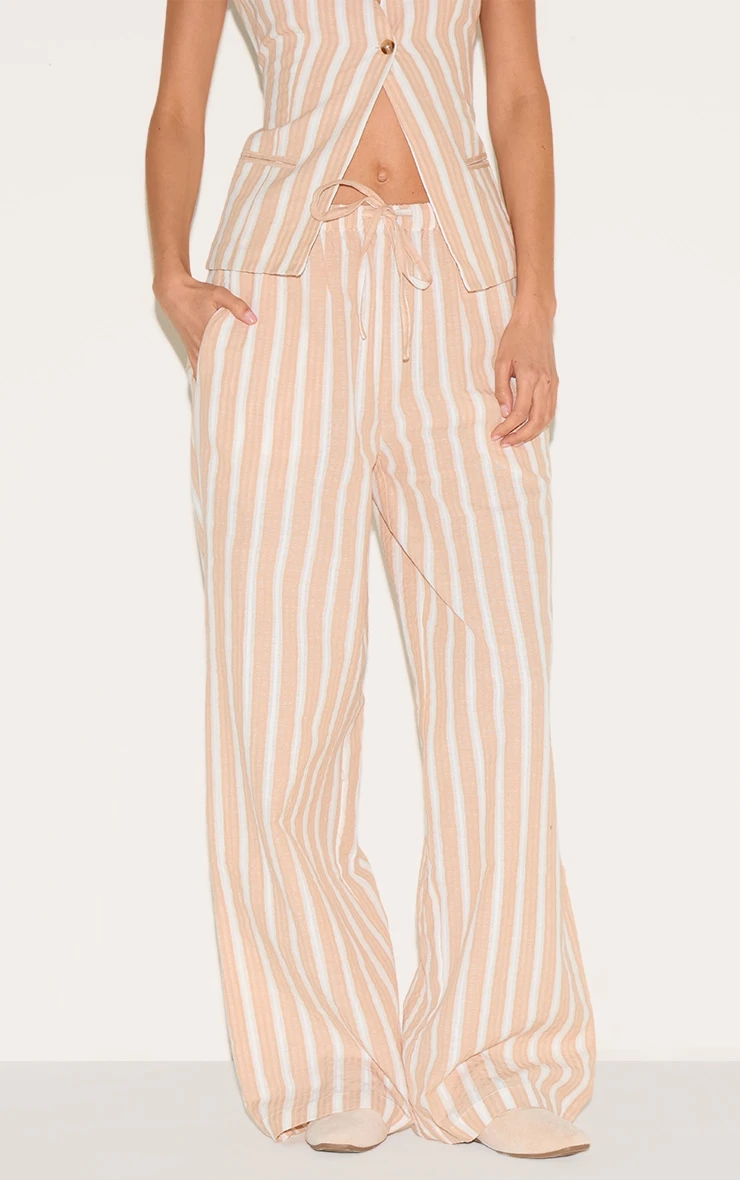 Brought to you in a peach hue material with a striped design, a drawstring detailing and a flattering wide leg fit. Team these peach striped drawstring wide pants with the matching short sleeve waist coat and a pair of ballet flats to finish off the look.