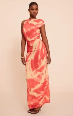 Demand attention with a look that’s both vibrant and refined. The pink abstract printed chiffon ruched maxi dress effortlessly combines a striking design with an artful cut. Its contemporary high neckline features subtle ruching, leading to an asymmetric, draped cap sleeve. A defined waistline flows into a sleek maxi skirt, complete with a confident side split that adds movement. This dress is primed for occasion wear, balancing its bold print with an elegant, streamlined shape. Complete your look with barely-there strappy heels and a compact clutch to let the dress command the spotlight. Own every room with this confidently artful piece.