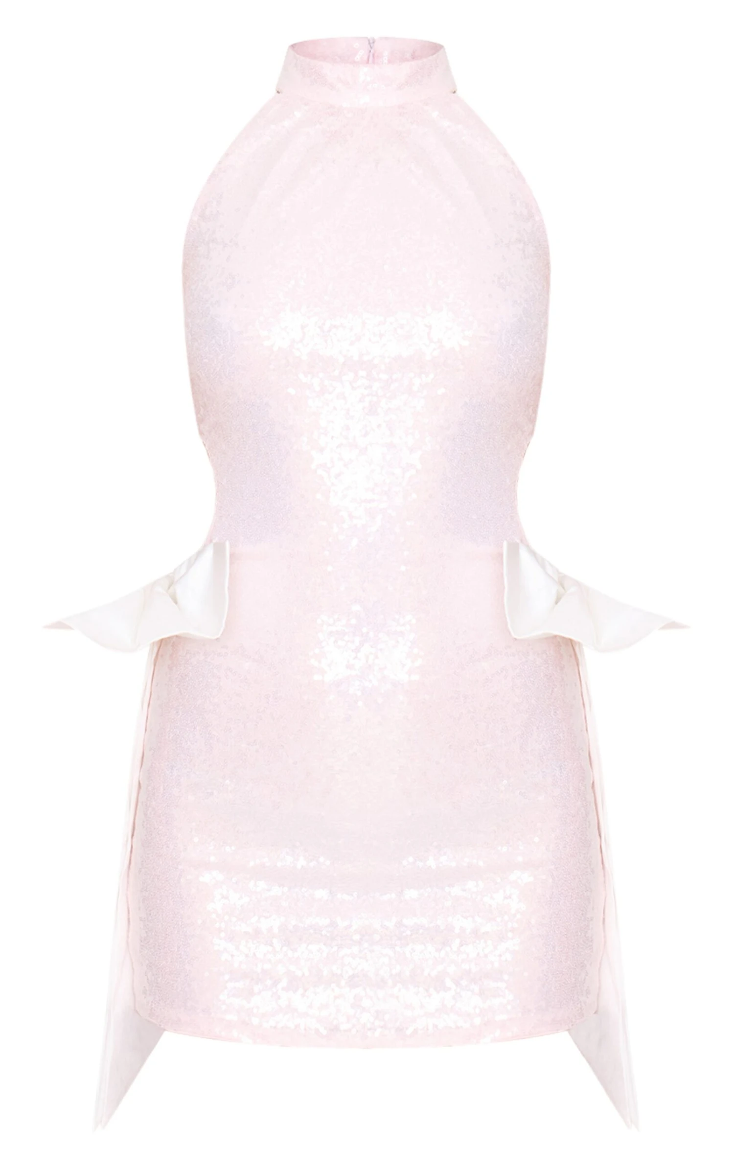 Consider this gold sequin mini dress your after-dark muse. The playful bow detail and strategic cut-out lend a touch of modern femininity to the shimmering sequin fabrication. Designed with a mini length, this piece is a confident statement. Finish the look with a delicate chain necklace from our jewelry collection to further elevate the silhouette.