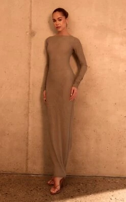 Crafted from a neutral taupe hue double layer mesh material with ruched sleeve detailing and a flattering maxi length that hugs your figure.
