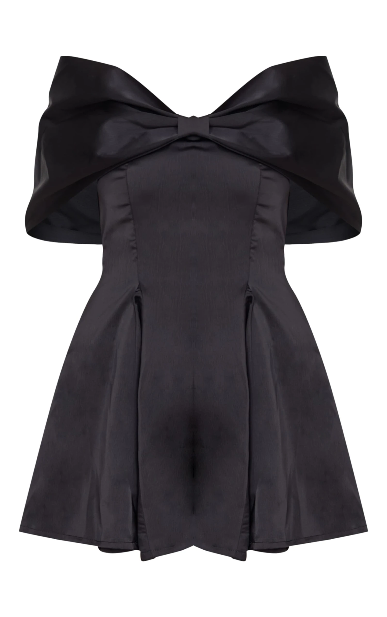 The black satin romper, reimagined. This piece strikes the perfect balance between sophisticated structure and statement detailing. Cut from a sleek black satin, the romper features an oversized bow that commands attention, adding a touch of drama to the streamlined silhouette. The tailored fit flatters without feeling restrictive. Consider it a modern alternative to the cocktail dress, easily styled with delicate jewelry from our collection for an elevated evening look.