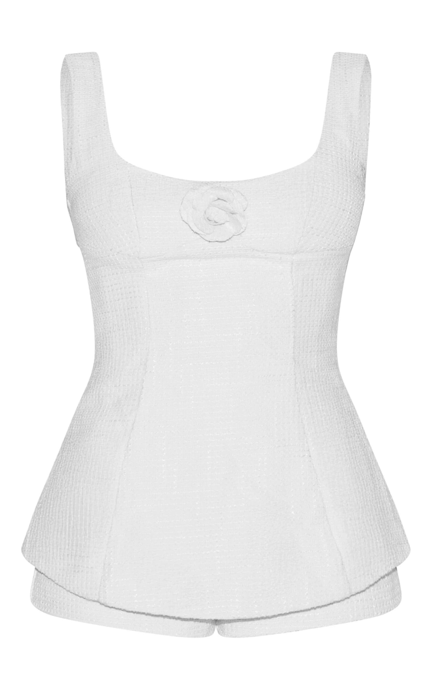 Keep your look playful with this premium white boucle camellia A-line romper. Featuring a white boucle material with camellia detailing and a structured A-line silhouette. Team this romper with a pair of heels and some statement gold earrings for standout finish.