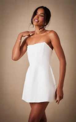Elevate your wardrobe with this white woven shift dress. The clean lines of the bandeau neckline are enhanced by subtle boning for a structured yet effortless silhouette. Cut from a crisp woven fabric, this dress offers a refined take on minimalist dressing. Style it with delicate gold jewelry from our accessories collection for an understated after-dark statement.