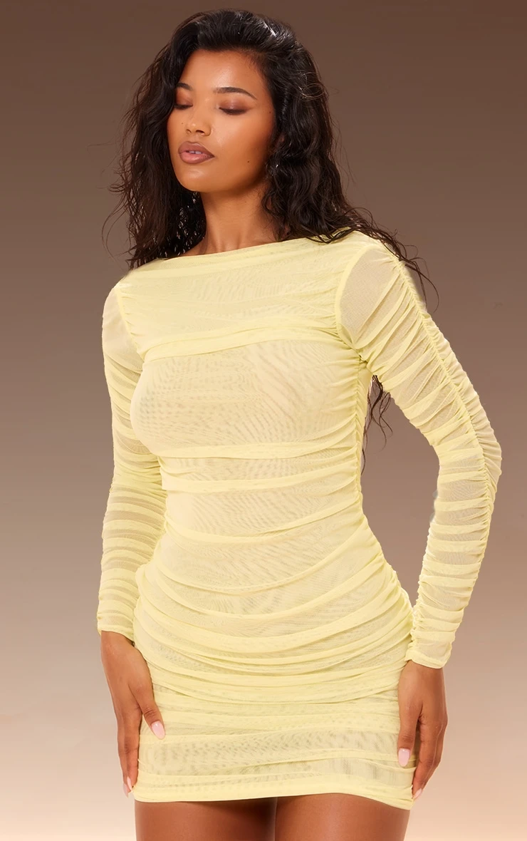Consider this your shortcut to curated after-dark dressing. This bodycon dress utilises considered ruching to subtly sculpt the silhouette, while the long sleeves add a touch of elevated coverage. The double-layer mesh in vibrant yellow offers a contemporary update on a classic form. Crafted for confident evenings, consider offsetting the bodycon silhouette with sculptural earrings for a directional finish.