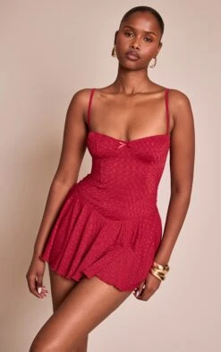 Own the night with an undeniably bold aesthetic. The red textured lace strappy skort floaty romper makes a confident statement, featuring a structured bustier bodice with the distinct textured lace visual and a subtle bow detail, complemented by thin spaghetti straps and a floaty skort hem that creates an impactful mini silhouette. This piece is perfect for an evening out, styled effortlessly with barely-there nude heels and stacked gold jewelry to complete a look that’s both fierce and refined.