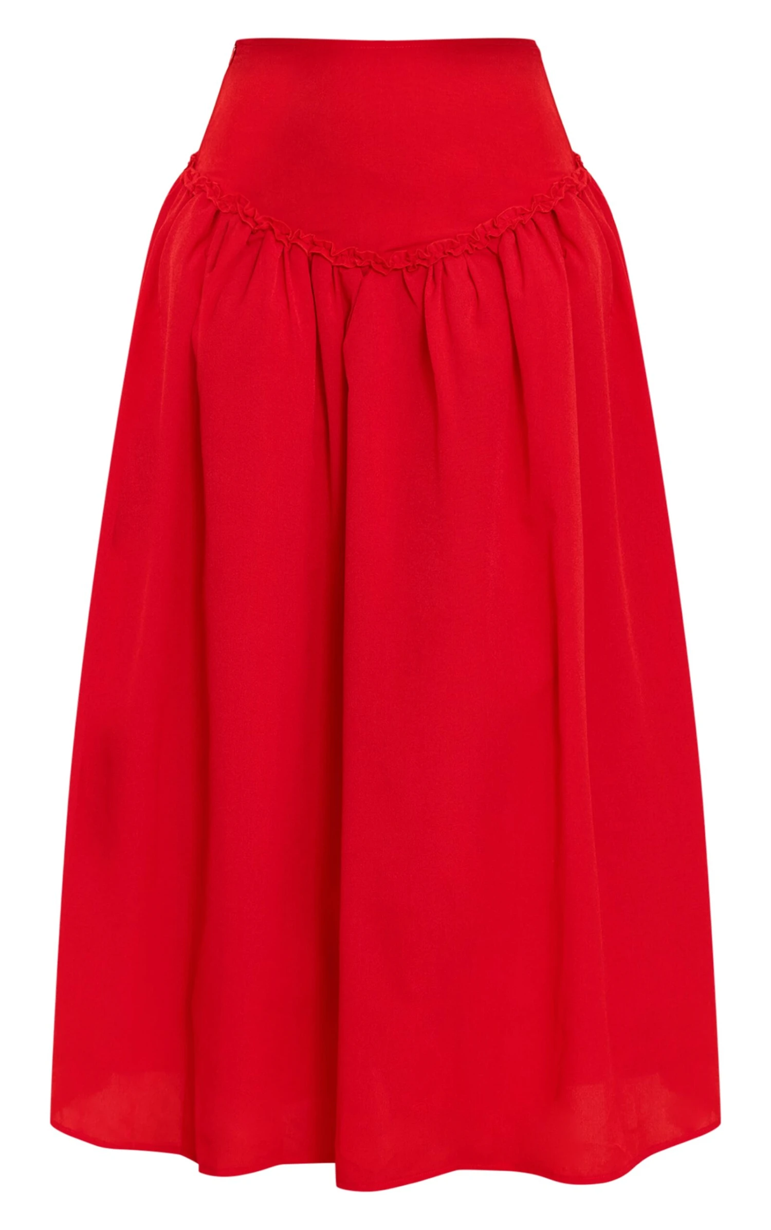 Bold and romantic, the red volume maxi skirt is designed to make an entrance. With a full silhouette and a flattering high waist, it pairs effortlessly with a fitted white top and statement earrings for a dramatic yet elegant evening look.