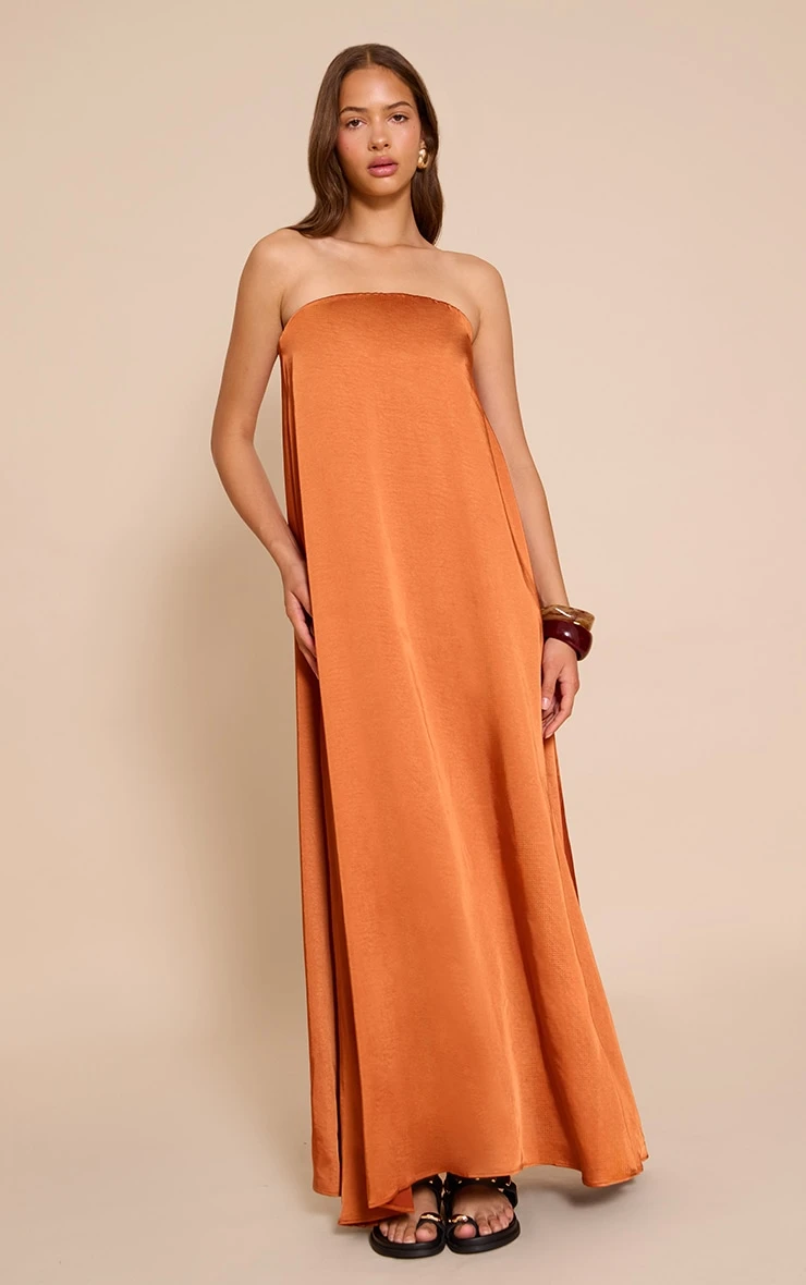 Go for glam in the rust textured satin bandeau column dress. Made in glossy satin with a textured finish and sleek column fit, this strapless dress is effortlessly elegant. Add gold accessories and a clutch for the perfect evening look.