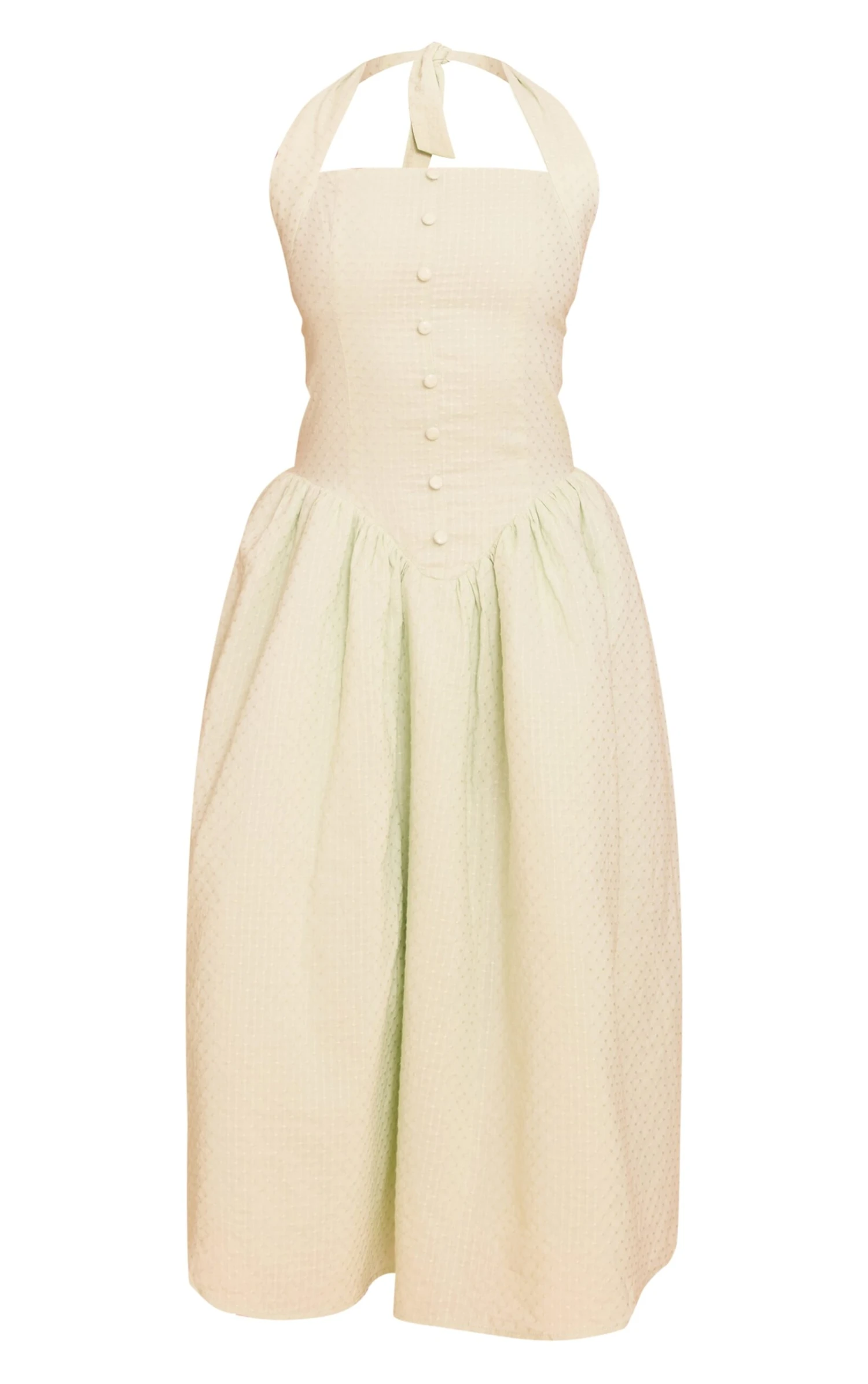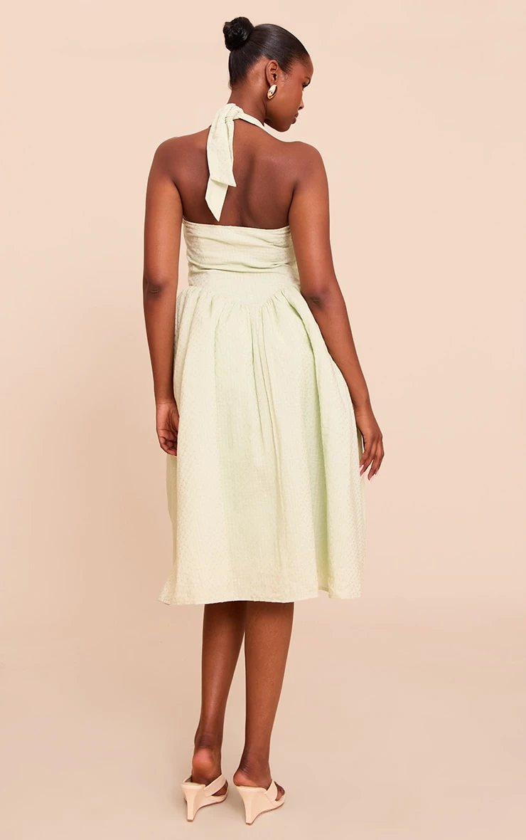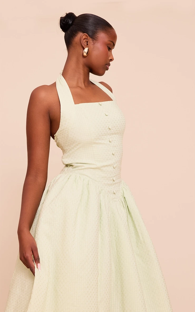 Level up your evening wear collection with this sage embroidered cotton halterneck midaxi dress. Brought to you in sage material, this dress has delicate embroidery, a halter neckline and a chic midaxi length fit. Pair this piece with neutral toned heels, a white bag and your favorite earrings.