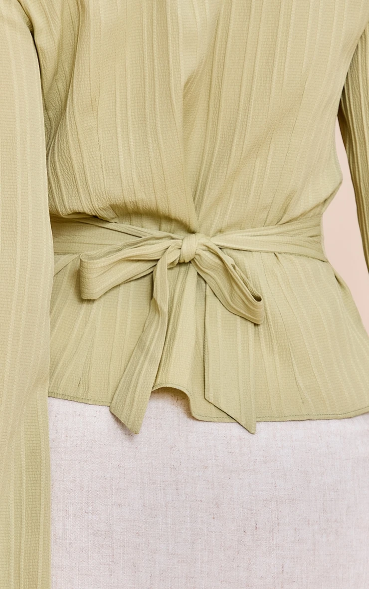 Breathe new life into your shirts with the sage green textured satin tie back shirt. Featuring subtle sheen, soft texture and a waist tie back, this piece blends smart with statement. Style it with a white mini skirt and barely-there heels for an elevated daytime look.