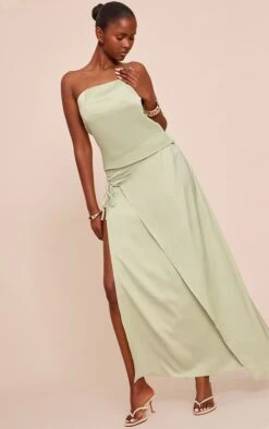 The sage satin wrap maxi skirt brings timeless sophistication to any occasion with its fluid satin finish, wrap detail that cinches the waist, and soft sage hue that evokes a serene elegance. The slit created by the wrap silhouette adds both movement and a subtle flash of skin, while the midi-to-maxi length offers versatile styling. Wear it as part of a two piece set with the matching bandeau top, nude heels, and a clutch for an elevated ensemble that works across seasons.