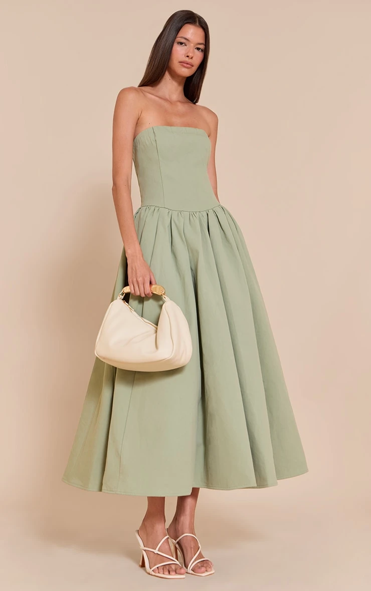 A fresh perspective on occasion dressing arrives with the sage woven bandeau ruched skater midaxi dress. Its clean bandeau neckline forms a striking, strapless line, complementing a precisely fitted bodice that neatly cinches the waist. From this defined point, the voluminous skater skirt flares out beautifully with clever gathering, creating a distinct profile that finishes at a contemporary midaxi length. This knowing piece is perfected with sharp accessories; consider barely-there heels and a sleek clutch to command any room.