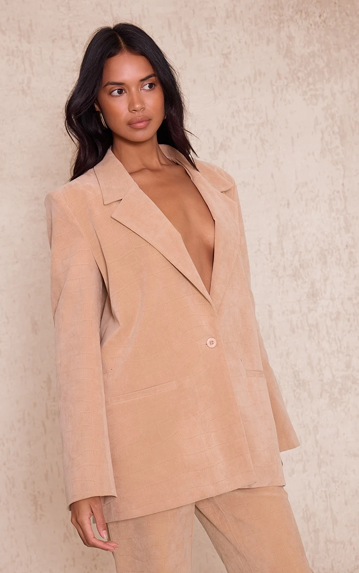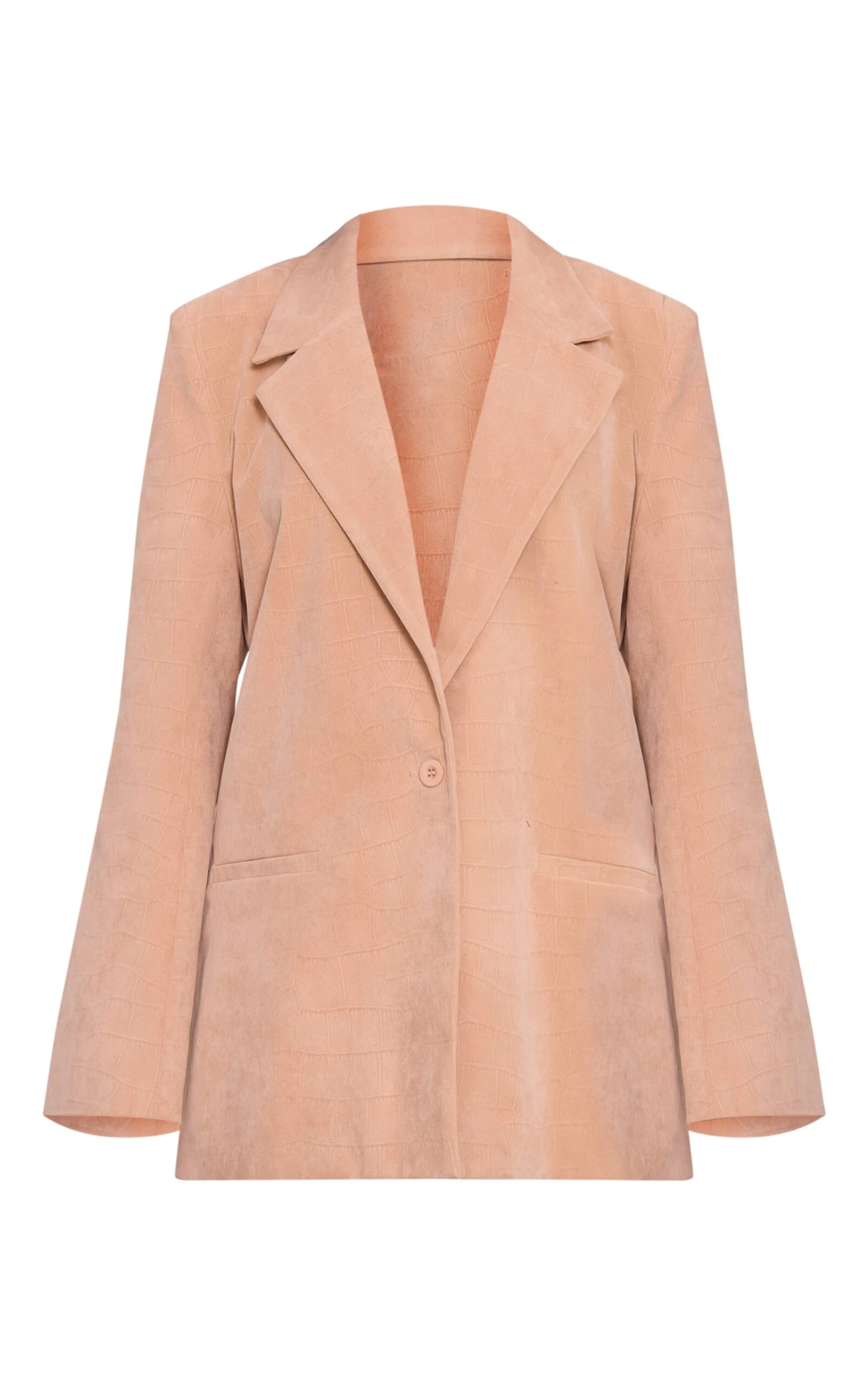 Stay sleek with the sand croc suede blazer. Made from a sand croc embossed suede fabric, it features a tailored silhouette, sharp lapels, and a single breasted fastening. Perfect for layering over dresses or pants, this blazer is a versatile wardrobe staple. Pair with kitten heels and gold earrings for an effortlessly chic finish.