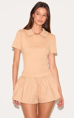 Say hello to your new season staple with this sand rib polo collar detail skort romper. Finished with value fastenings and pleated shorts, this romper is crafted from sand hue material. Upgrade your look with chunky sneakers and minimalistic gold earrings.