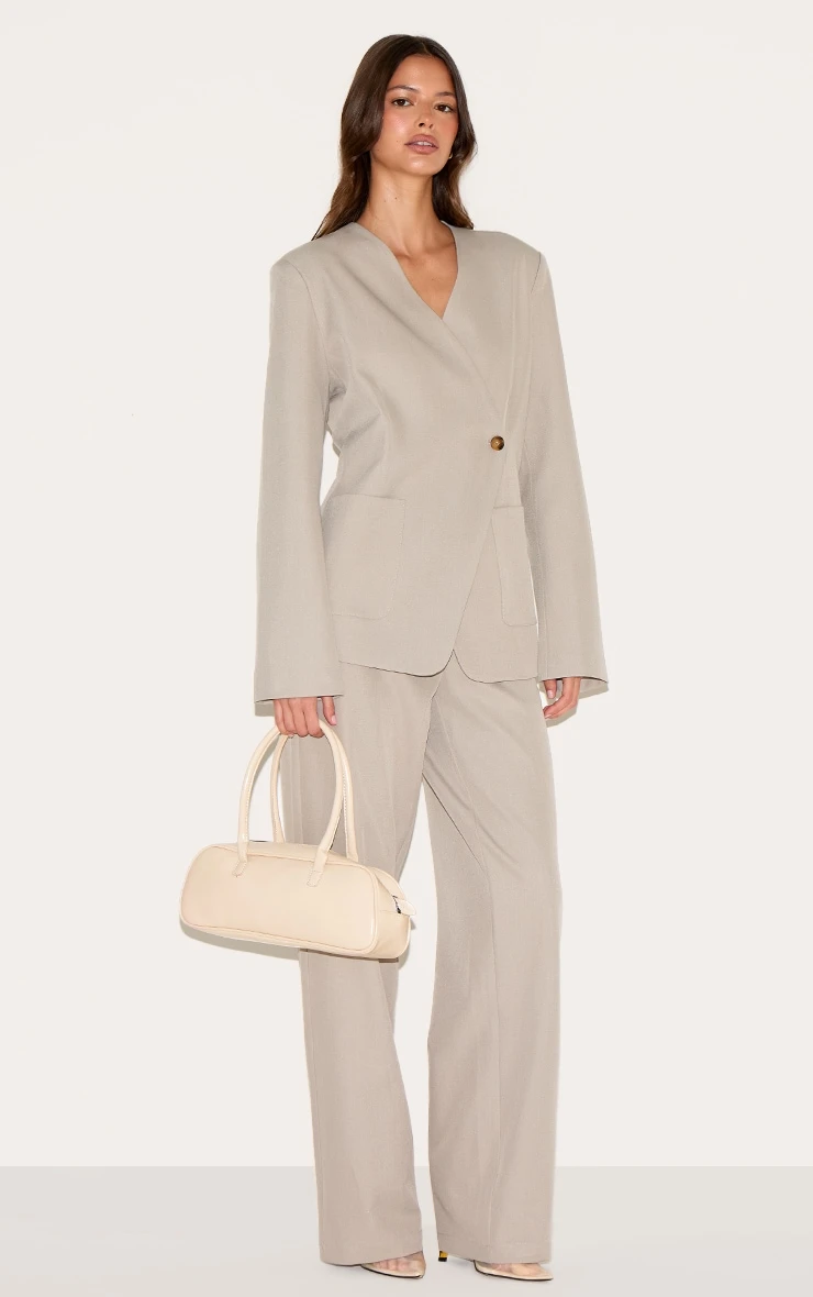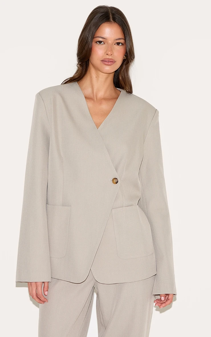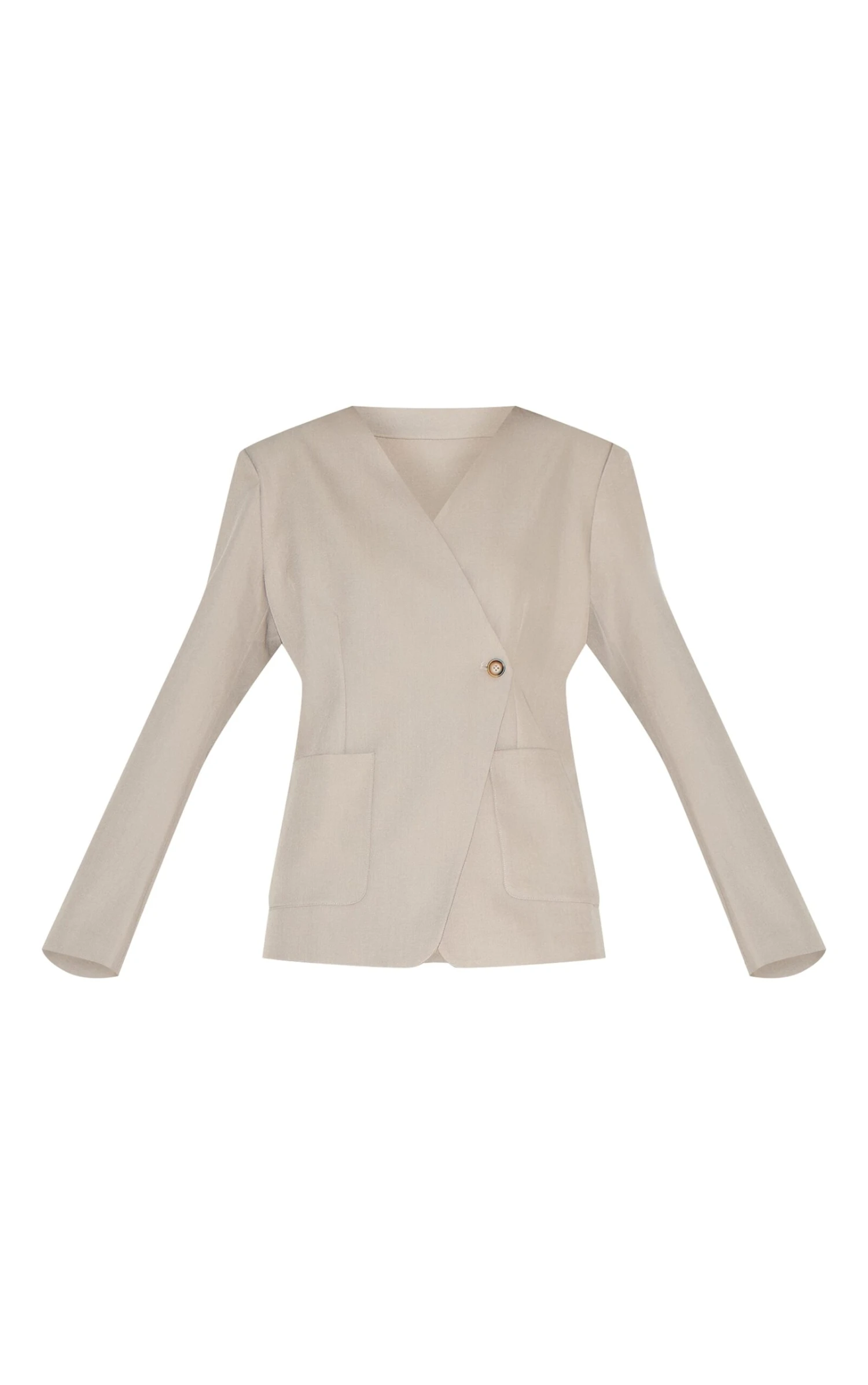 Brought to you in a sand hue woven material with an asymmetric value fastening and pocket detailing. Add a touch of luxe to your outfit with the sand tailored woven asymmetric blazer and team it with the matching pants, neutral strappy heels and a pair of chic earrings.