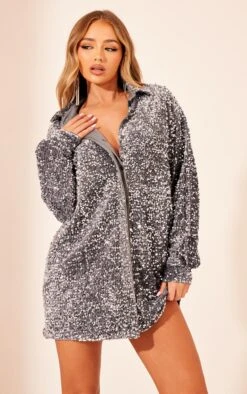 Elevate your after-dark aesthetic with this silver velvet sequin shirt dress. The considered silhouette is cut in an oversized fit, allowing for versatile styling – think cinched with a belt for definition or worn open as a directional layering piece. The tactile velvet base shimmers with light-catching sequins, offering a subtle yet impactful statement. Consider this a contemporary alternative to traditional occasion wear. Team with a pair of our barely-there heels for a considered, confident ensemble.