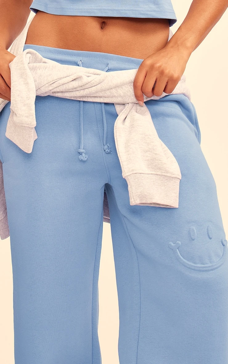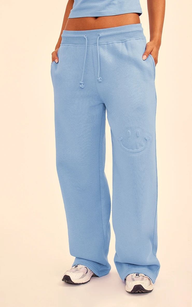 Amp up your off-duty wardrobe with these steel blue smile embossed wide leg sweatpants. Brought to you in a steel blue hue material with a smile embossed design and wide leg fit, these sweatpants are at the top of our wish list. Style with the matching top, your fave hoodie and fresh kicks for a chic sweatpant set we can’t get enough of.