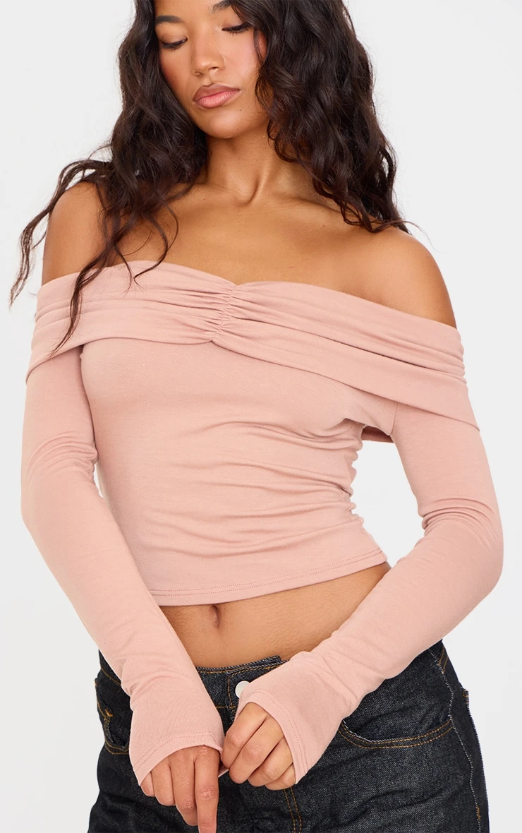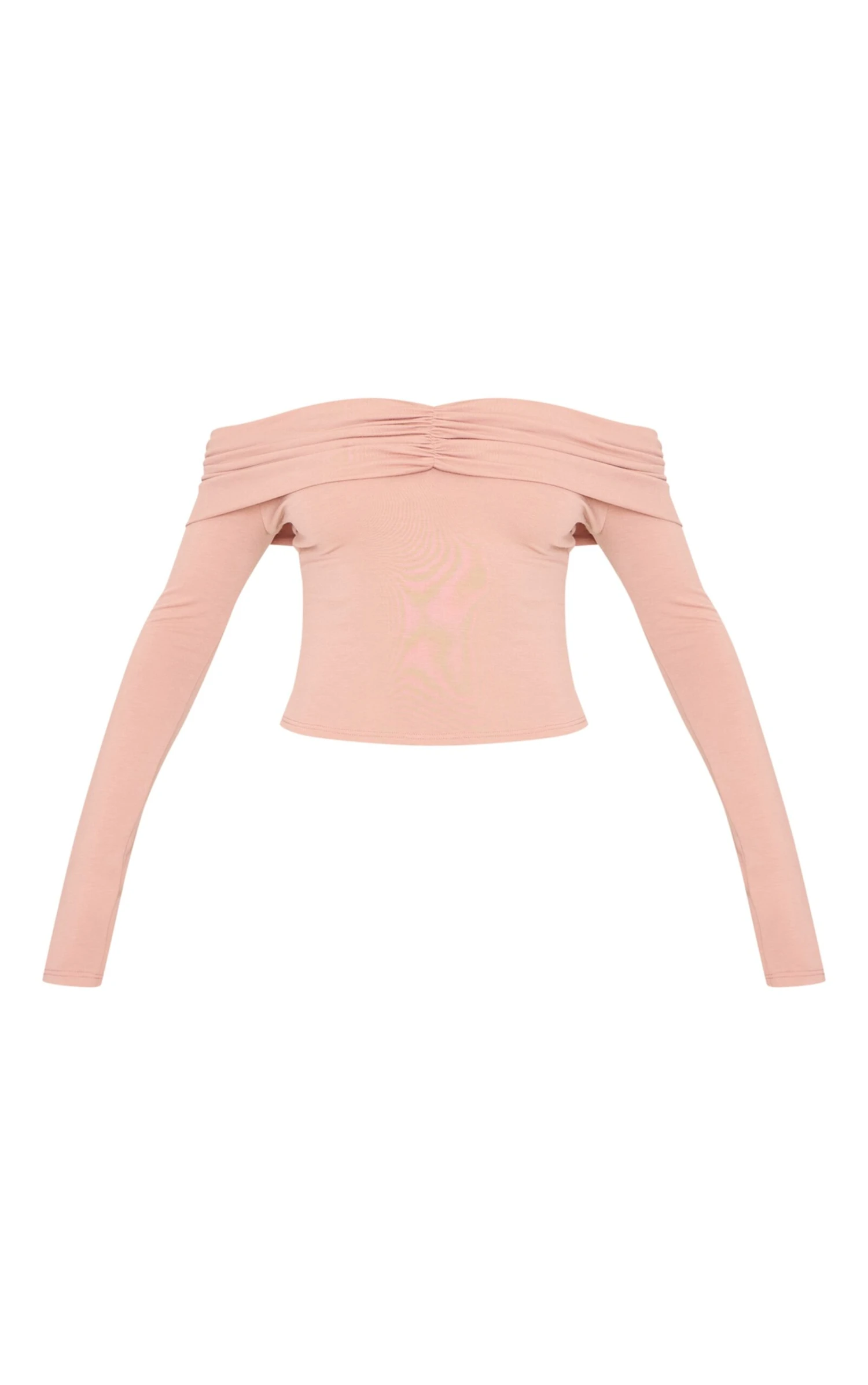 The modern foundation piece, consider this stone jersey crop top your new style essential. Crafted in a soft-touch contour jersey, the foldover bardot neckline introduces a subtle architectural detail, elevating the silhouette. Ruching throughout enhances the drape and adds a refined textural element. Style yours with tailored pants for a study in considered contrasts.