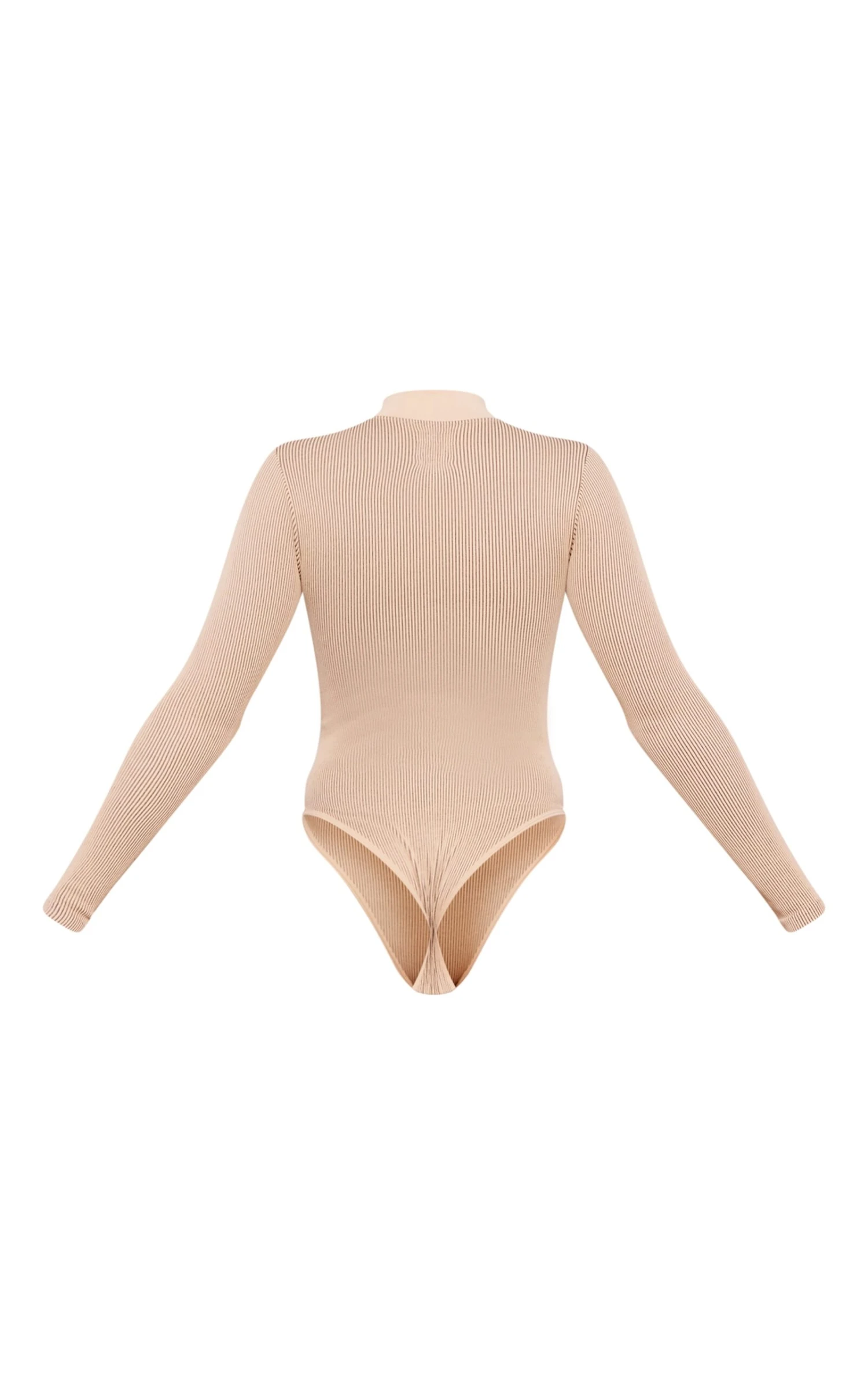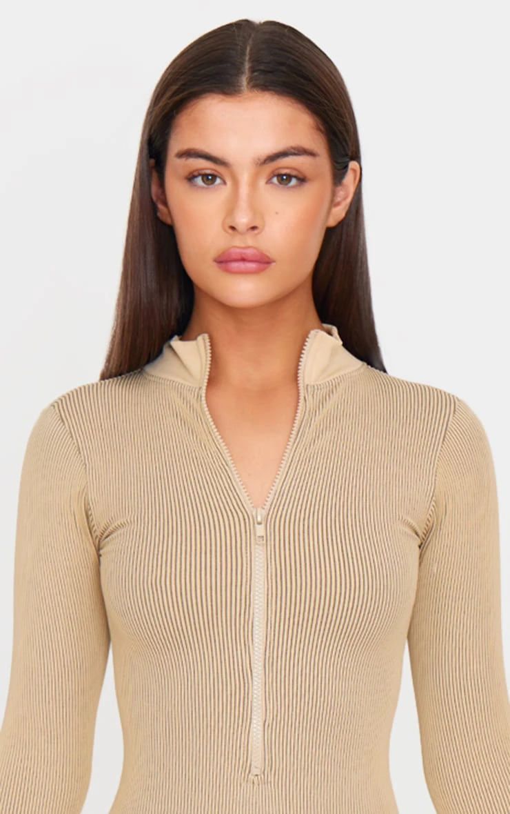 Elevate your core wardrobe with this stone-hued, long-sleeved bodysuit. The ribbed knit contours the silhouette, whilst a zip-up front allows for versatile styling – wear it fully fastened for a streamlined effect or partially open to subtly frame the décolletage. The neutral tone lends itself to endless pairings, but we suggest anchoring it with a pair of wide-leg tailored pants for a considered, contemporary aesthetic.