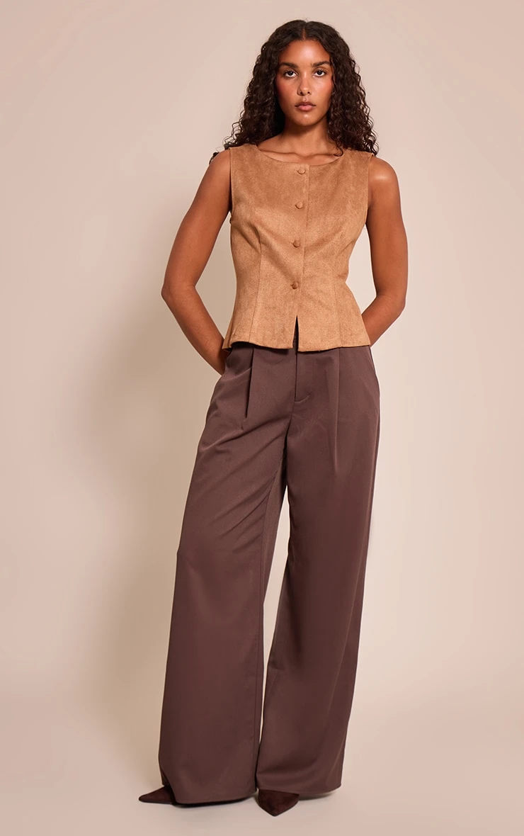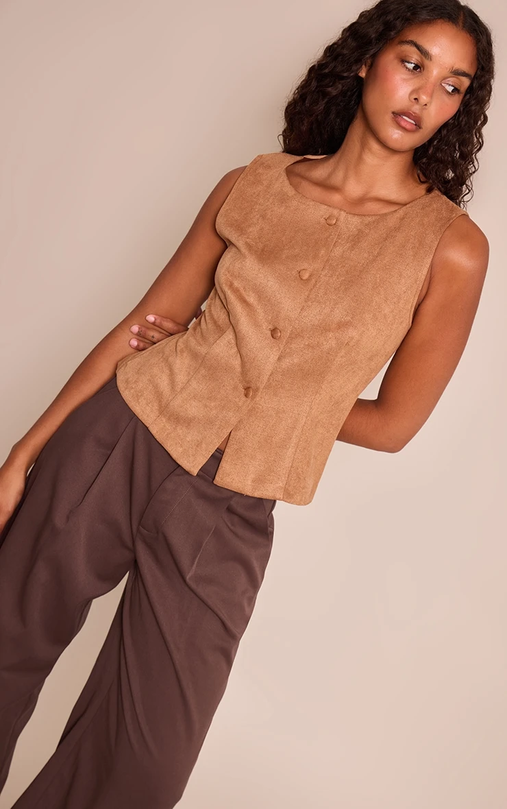 Exude confidence in the tan faux suede popper detail vest. Made from a tan faux suede material, it features popper detailing, a sleeveless cut, and a tailored silhouette. Pair with kitten heels and gold earrings for timeless sophistication.