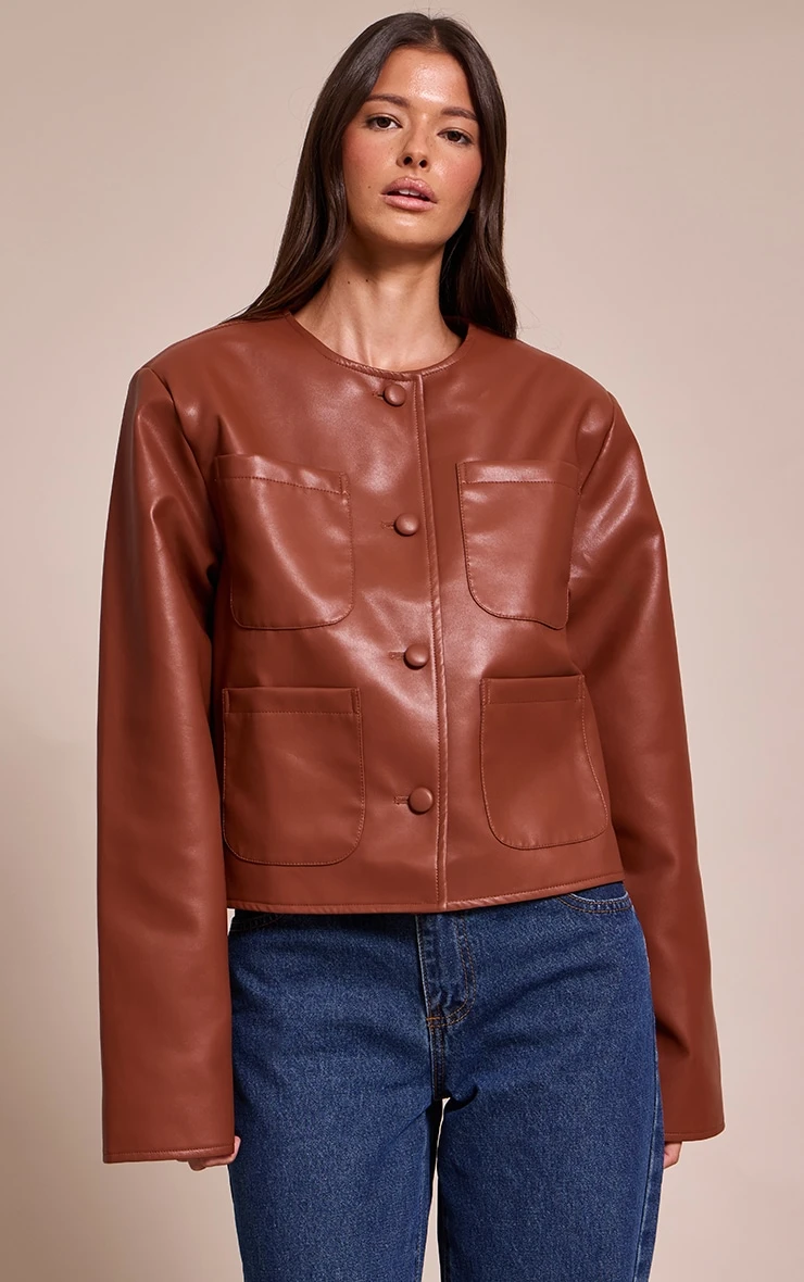 A contemporary classic for your outerwear rotation, the tan pocket detail faux leather jacket redefines the everyday layer. Its clean, collarless round neckline and neat value-front fastening create a minimal yet impactful line, complemented by a relaxed cropped cut and full-length sleeves. Four distinct patch pockets add a utility-inspired detail, making this piece perfect to throw on over a fitted Vest and high-waisted wide-leg pants. Finish the look with chunky sneakers for a confident day aesthetic that’s all your own.