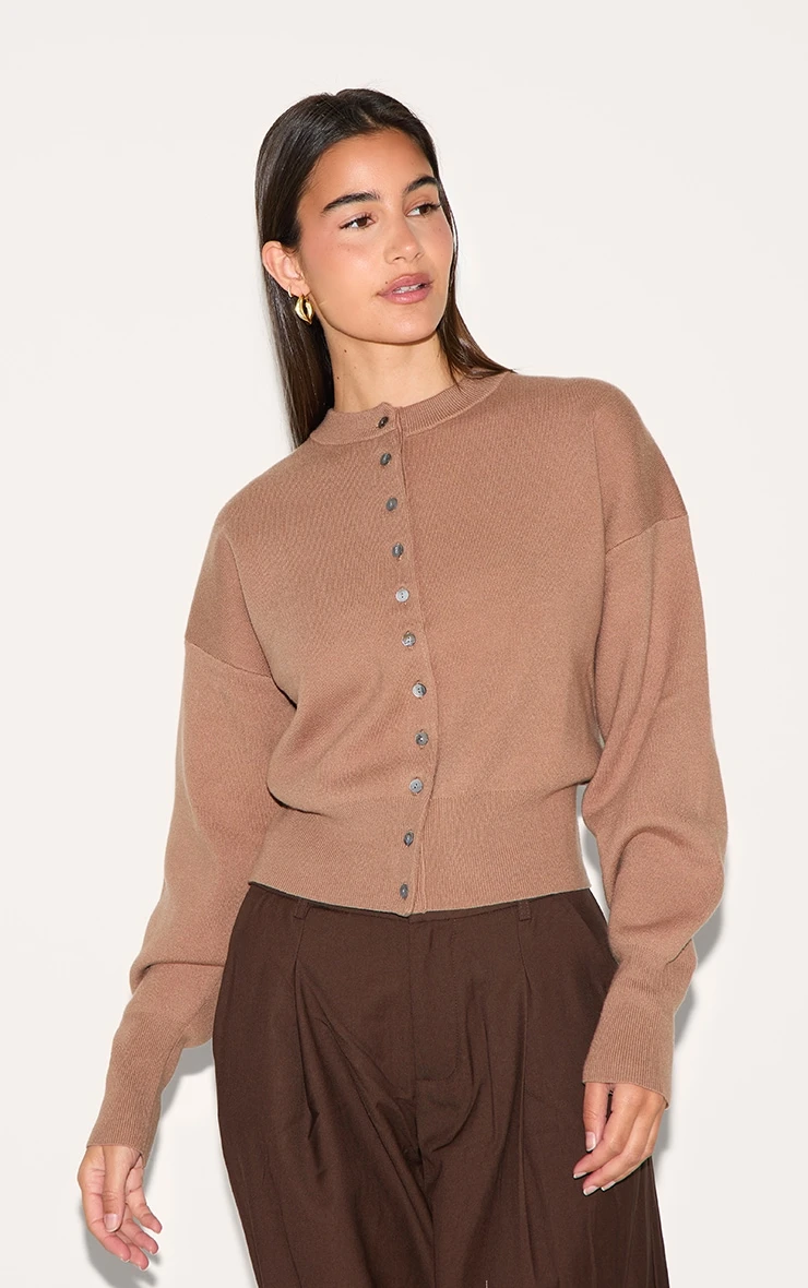 Elevate your layering game with this taupe compact knit value-through cardigan. Crafted from a soft, compact knit fabric, a value-through design and a cozy, yet structured fit. Style with high-waisted wide leg pants and some flat loafers for a chic, casual finish.