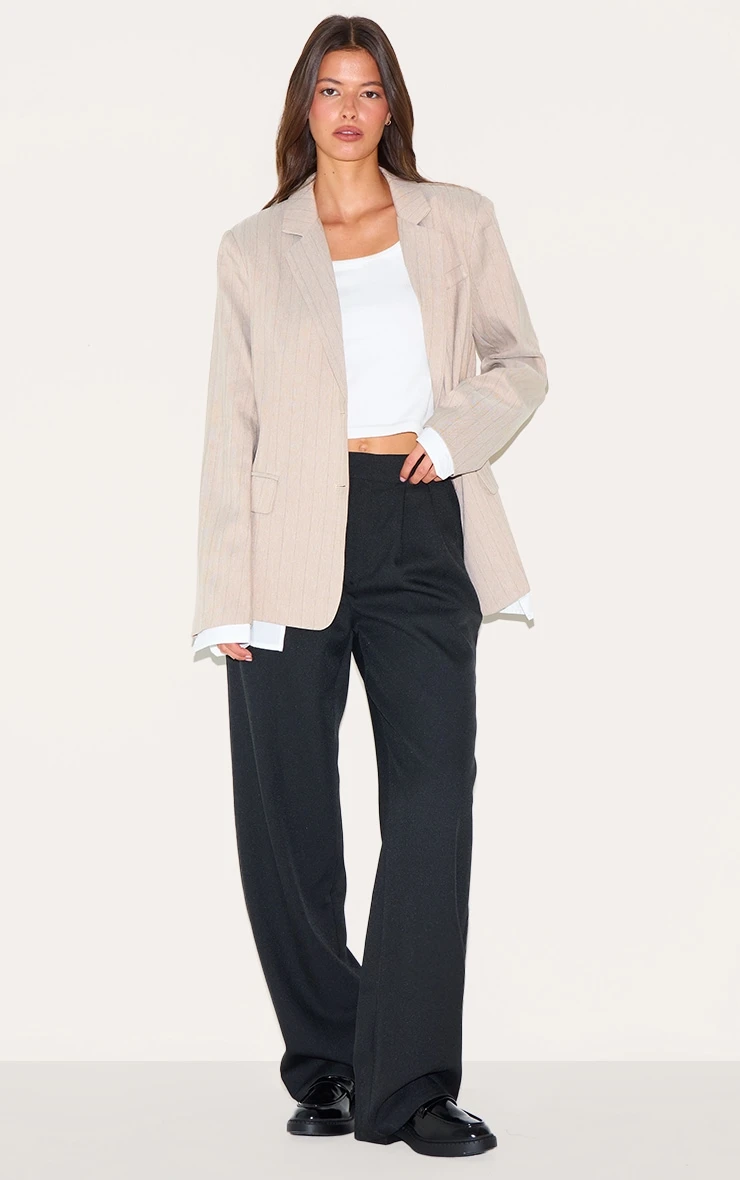 Elevate your outfit of the day with a subtle touch of chic in this taupe pinstripe shirt detail blazer. Made from a taupe hue material with a pinstripe design and shirt detailing, how can you say no? Style this taupe blazer with a basic top, comfy pants and loafers for a chic look like no other.