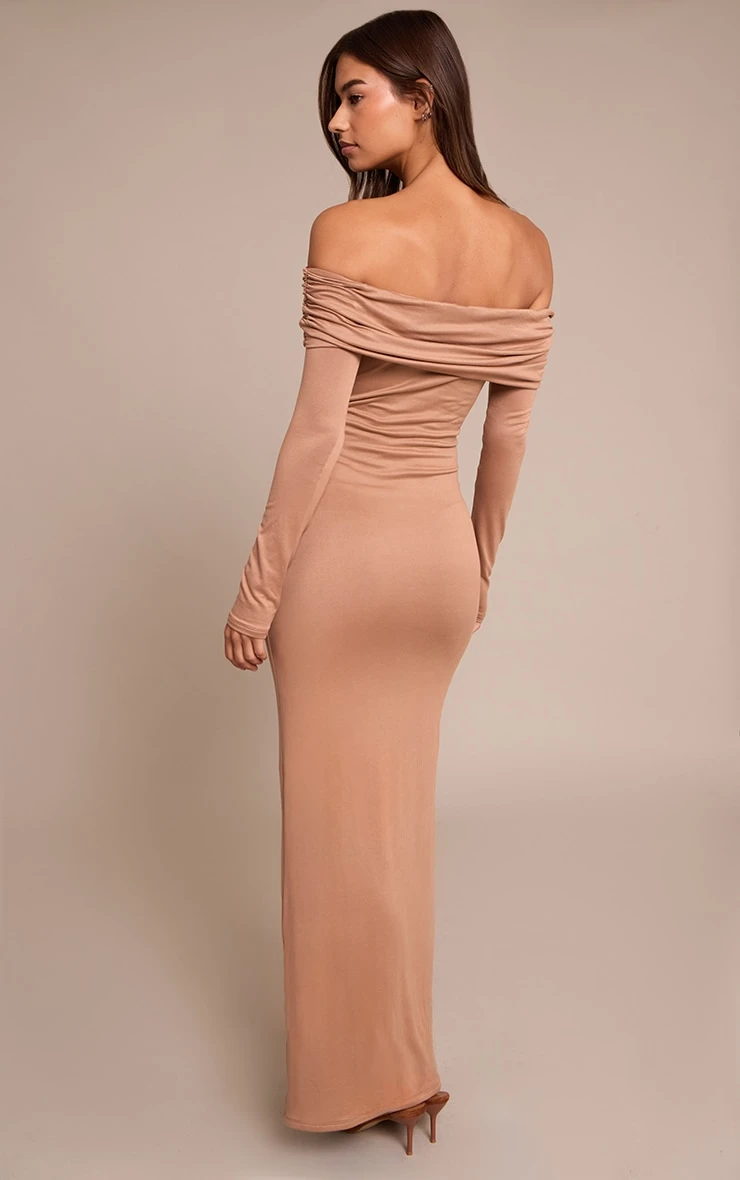 Confidence manifests in clean lines and considered cuts. The taupe soft touch jersey bardot maxi dress embodies this ethos, featuring an elegant off-the-shoulder bardot neckline with delicate ruching that frames the shoulders. Its sleek bodycon silhouette extends to a maxi length, creating a refined profile perfect for day. Anchor this ensemble with sharp mule heels and add subtle gold earrings for a discerning finish that understands impact.