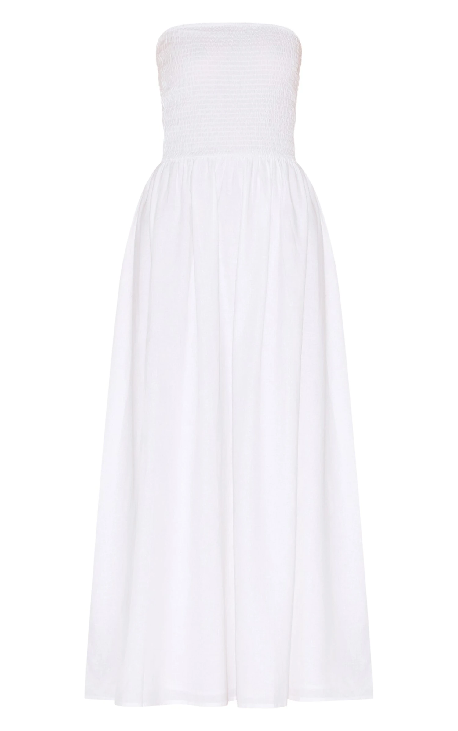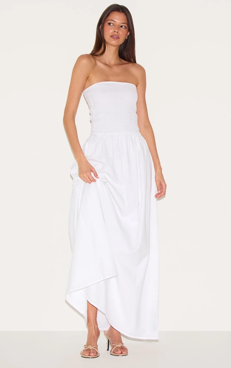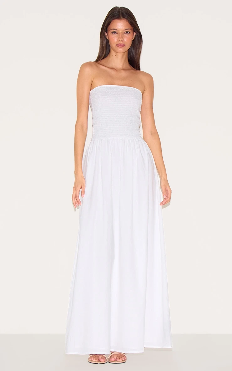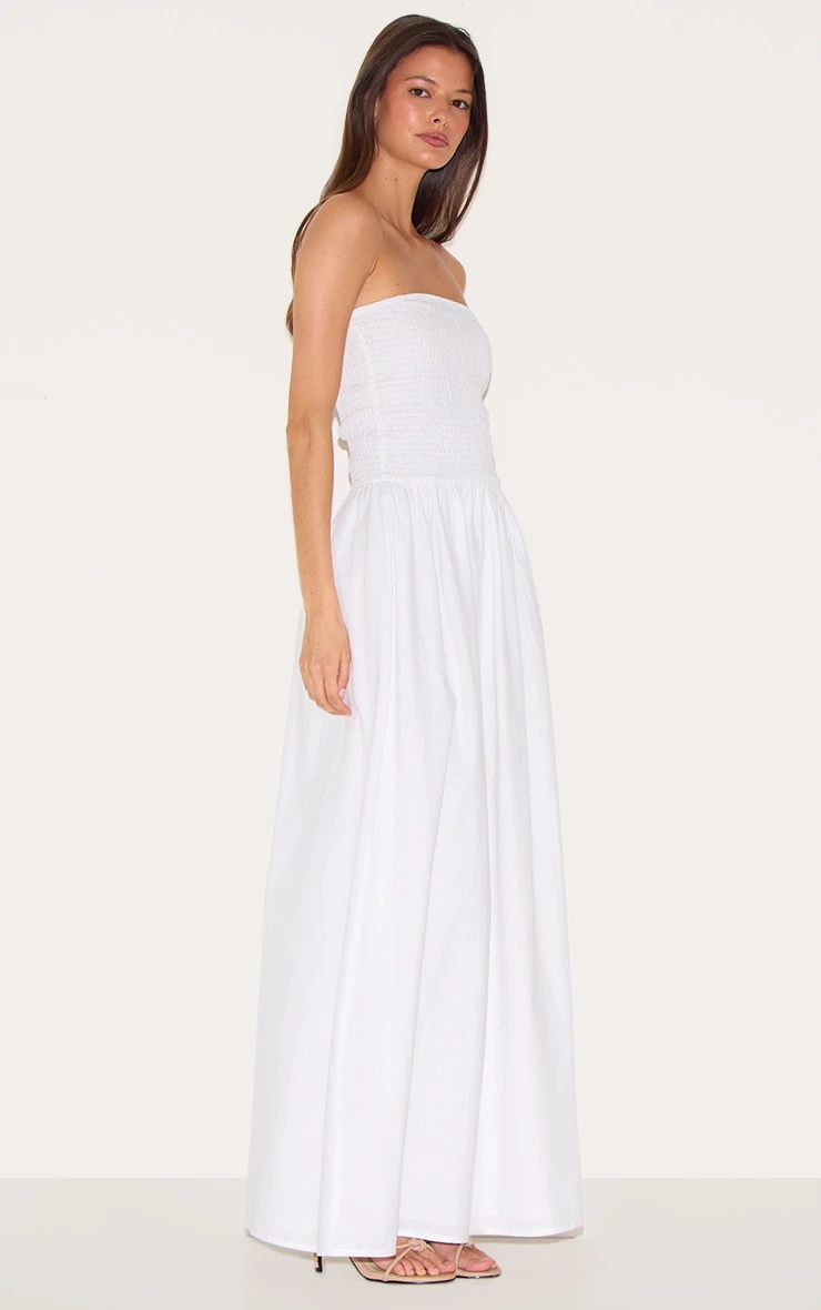 Turn heads in this white bandeau shirred detail maxi dress. Brought to you in a white material with a bandeau fit, a shirred detail and a maxi length. Finish the look and pair this dress with a pair of sandals and your favorite accessories for a fool-proof finish.
