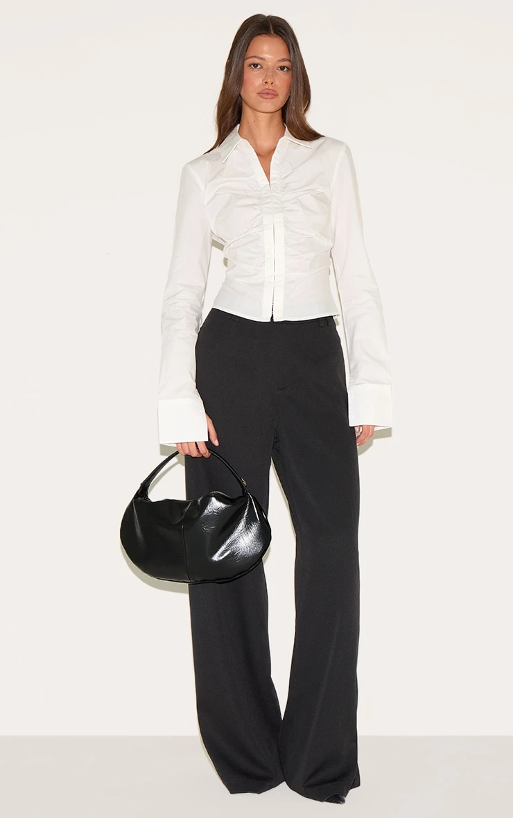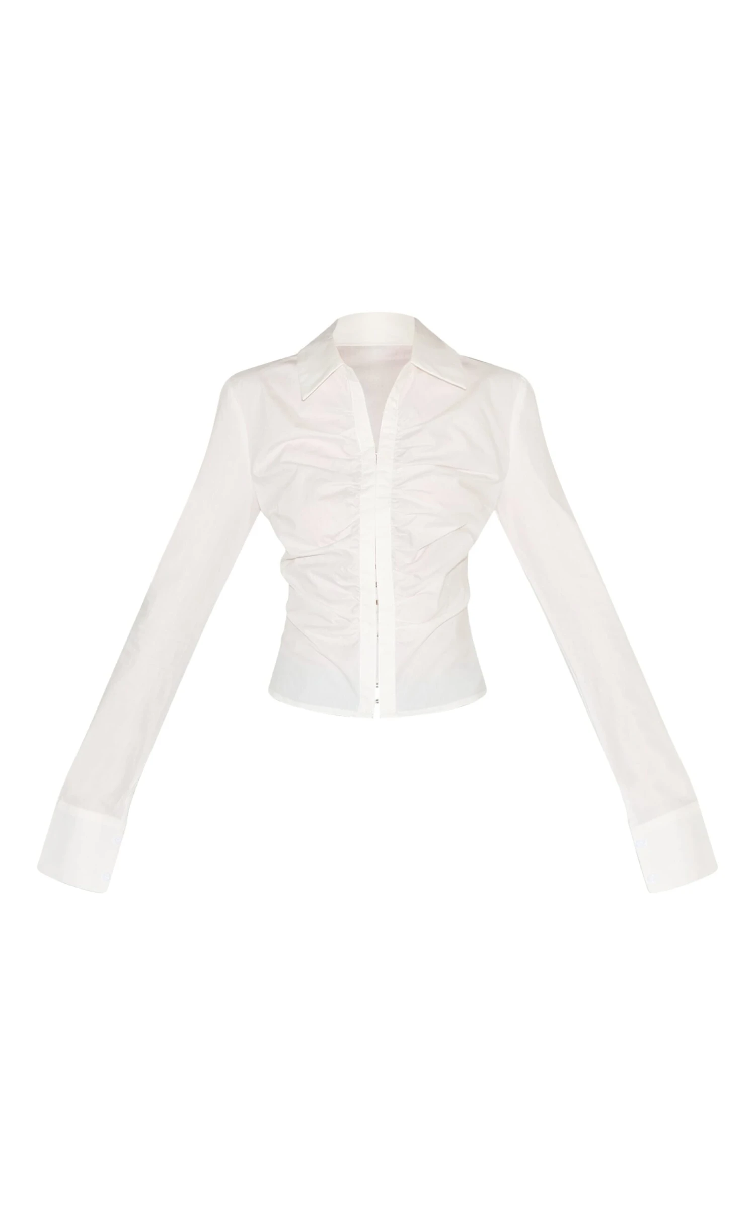 Refine your off-duty edit with this contemporary take on a classic. This white fitted shirt features hook and eye detailing for a subtle subversion of structure, while the ruching adds textural interest and accentuates the silhouette. Crafted in a crisp cotton blend, it offers both comfort and a refined finish. Elevate the look further by pairing it with tailored pants from our bottoms collection for a directional ensemble.