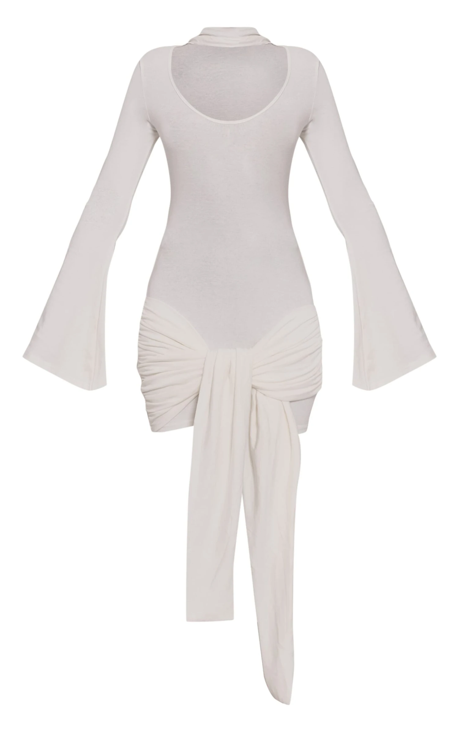 Your evening aesthetic just got an upgrade. The white jersey wrap scarf detail mini dress speaks volumes with its directional design, featuring a bodycon mini silhouette that cinches with a striking wrap scarf detail at the waist, creating an alluring leg split. An open scoop neckline extends into a contemporary choker, complemented by long, subtly flared sleeves. For an impactful evening look, pair this piece with sky-high chunky heels and a sleek black clutch bag. This is your moment to own the room.