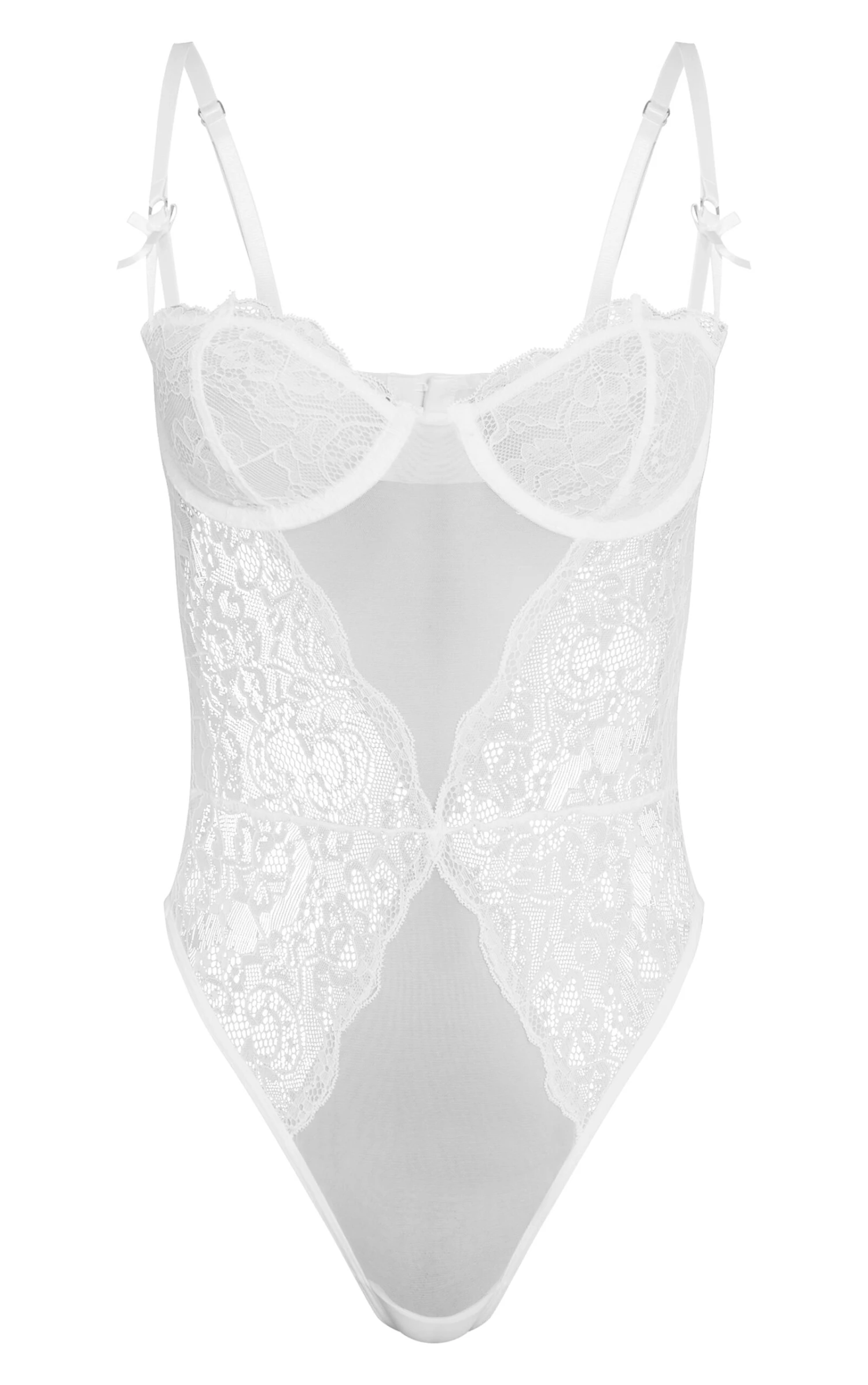 Keep it chic in this white lace underwired lingerie bodysuit. Brought to you in a white lace material with an underwired design. Team this lingerie bodysuit with your favorite accessories and add underneath your outfit of the day to finish off the look we are loving right now.