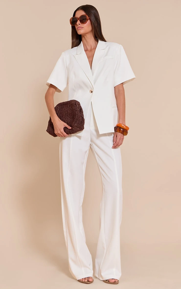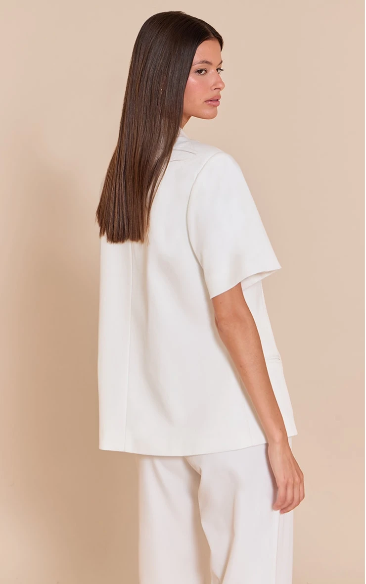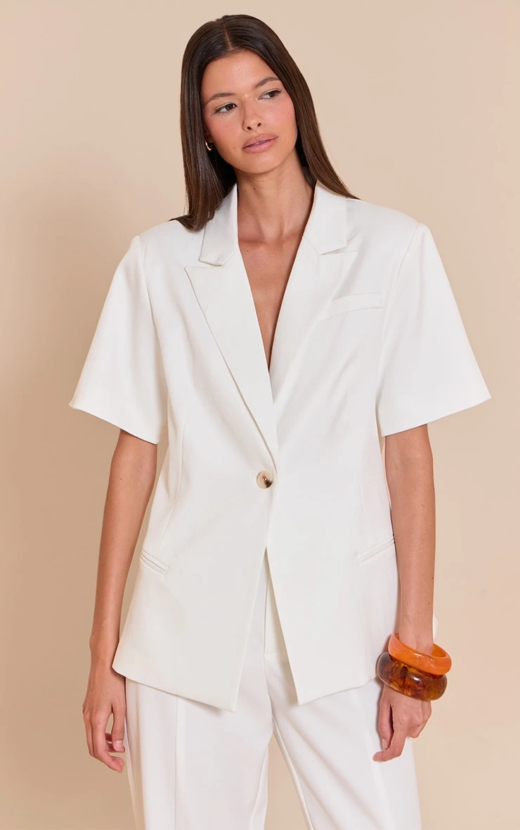Add a crisp finish to any look with this white short sleeve boxy single breasted blazer, a modern take on classic tailoring. Brought to you in a white woven fabric with a short sleeve design and boxy silhouette, it’s versatile and polished. Pair with denim or over a mini dress and gold accessories for a fresh update.