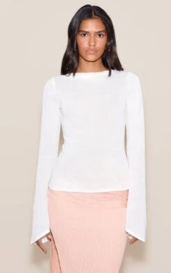 Turn heads in the white textured extreme flute sleeve long top. Featuring dramatic flared sleeves and a soft textured fabric, this longline piece is made for standout styling. Wear with a maxi skirt and flat sandals for a high-fashion silhouette.