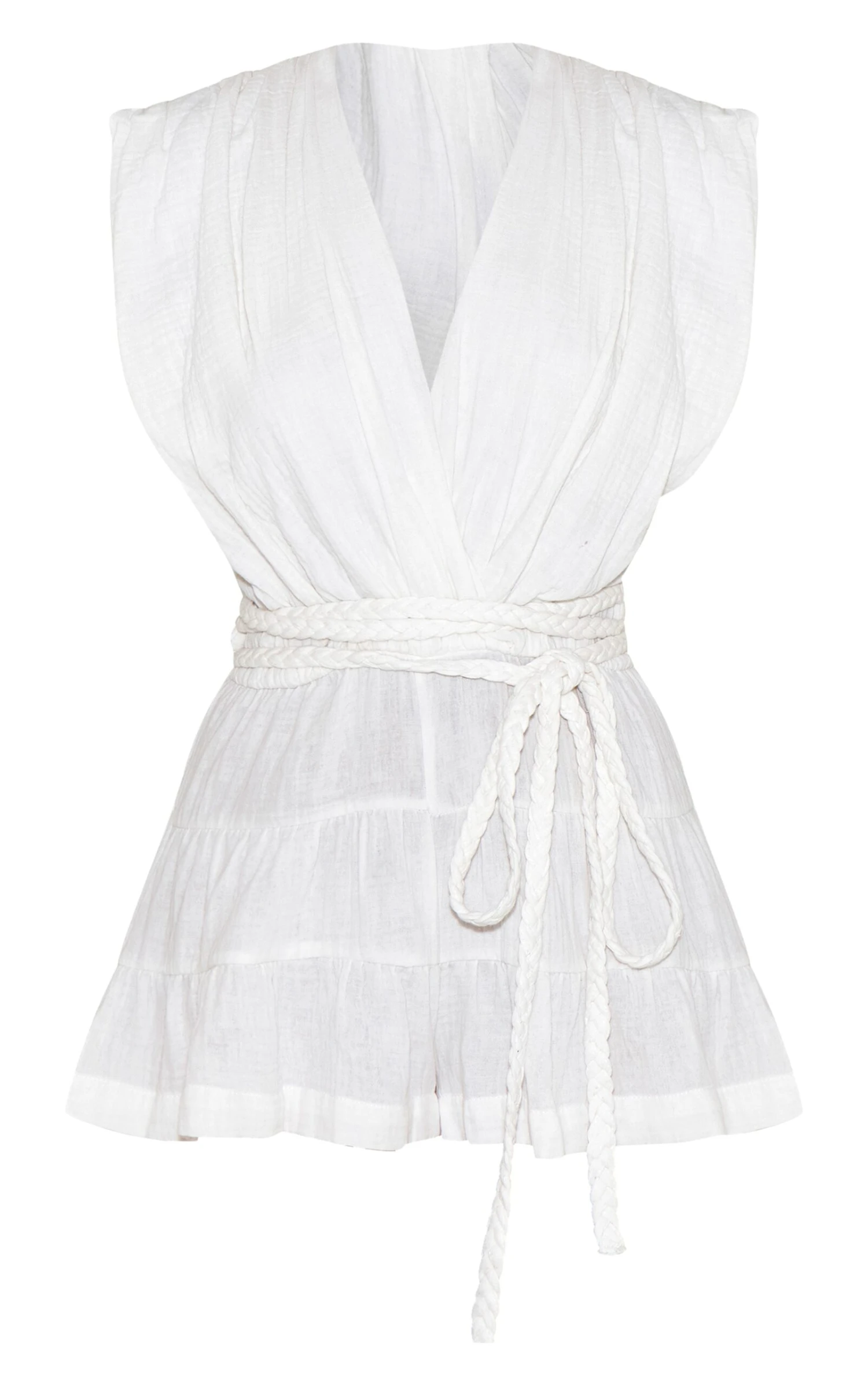Step into summer with the white textured V neck tie waist romper. Made from a white textured material, this romper features a deep V neckline and cinched tie waist. Style with gold jewelry and slip-on heels for a fresh, elevated look.