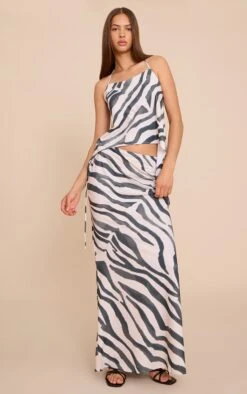 Turn heads in the zebra print floaty woven tie side low rise maxi skirt, designed to mix bold print with effortless style. Made from lightweight woven fabric featuring a low rise fit, adjustable tie side, and flowing maxi length that moves with grace. The striking zebra print adds drama and flair to your summer wardrobe. Pair with a simple black top and sandals to let the skirt shine.