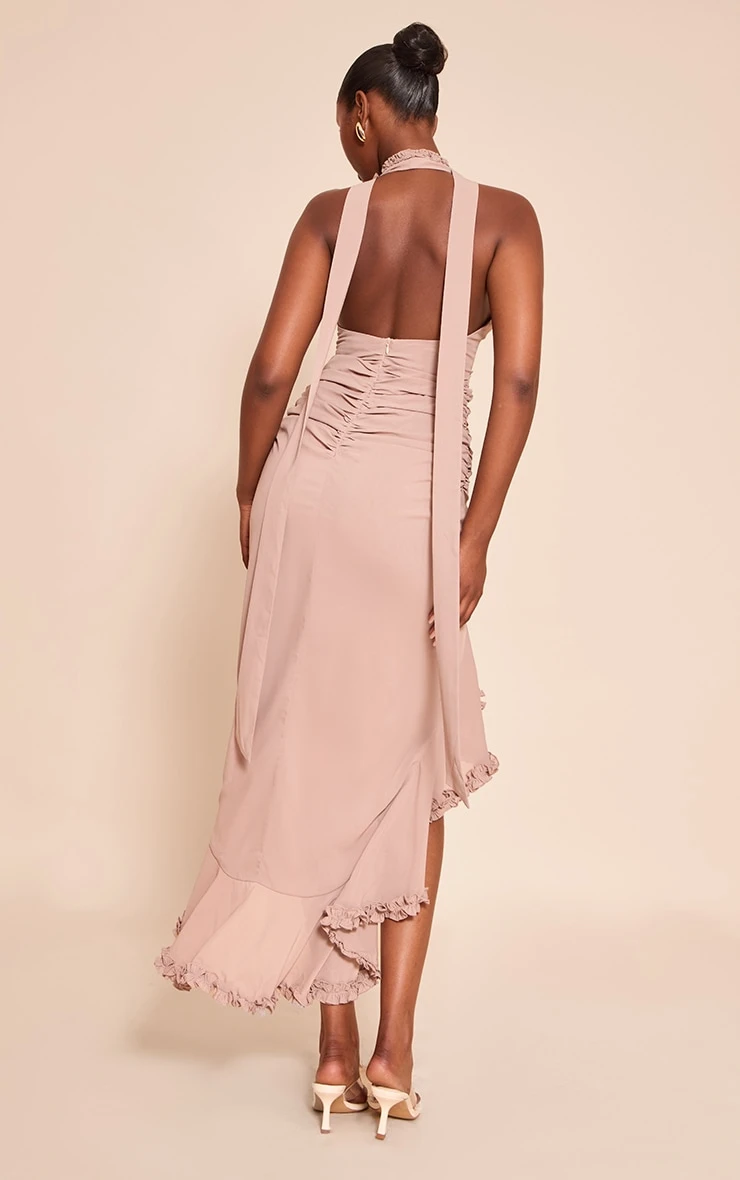 Define your occasion agenda with a piece that speaks volumes. The taupe ruffle detail plunge sleeveless maxi dress commands attention with its dramatic plunge V-neckline, framed by delicate ruffles that extend up to a chic choker design. Ruched detailing across the bodice creates a flattering, sculpted fit, flowing into a maxi skirt with an impactful high split and an asymmetrical hem finished with cascading ruffle trims. Complete this confident look with barely-there heeled mules and a structured mini bag for an entrance that won’t be forgotten.