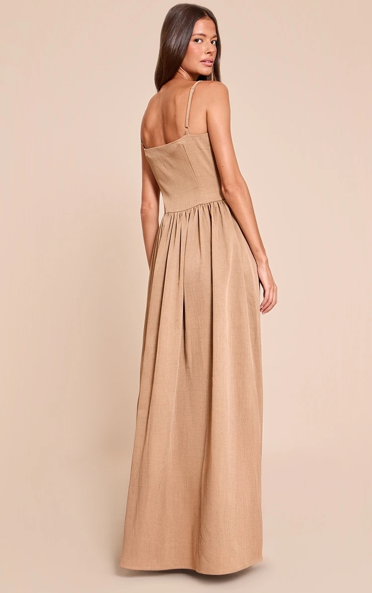 Navigate warmer days with an unforced sophistication. The taupe woven strappy bust detail maxi dress anchors a refined aesthetic, featuring a flattering sweetheart neckline with subtle bust shaping and delicate spaghetti straps that frame the décolletage. Its high, cinched empire waist beautifully transitions into a voluminous maxi skirt, creating an elongating, relaxed silhouette. Pair this versatile dress with sleek flat sandals and a woven tote bag for an effortless daytime presence, or layer a sharp, oversized white shirt over the top for a knowing, elevated finish.