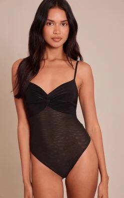 Prettylittlething Black Slinky Tie Shoulder Asymmetric Bodysuit