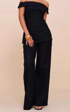 Prettylittlething Black Woven Diamante Draped Front High Neck Top